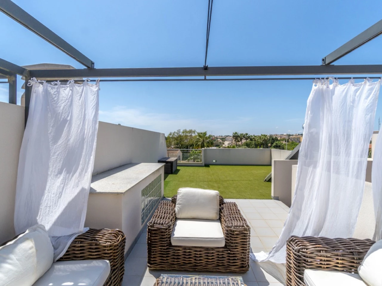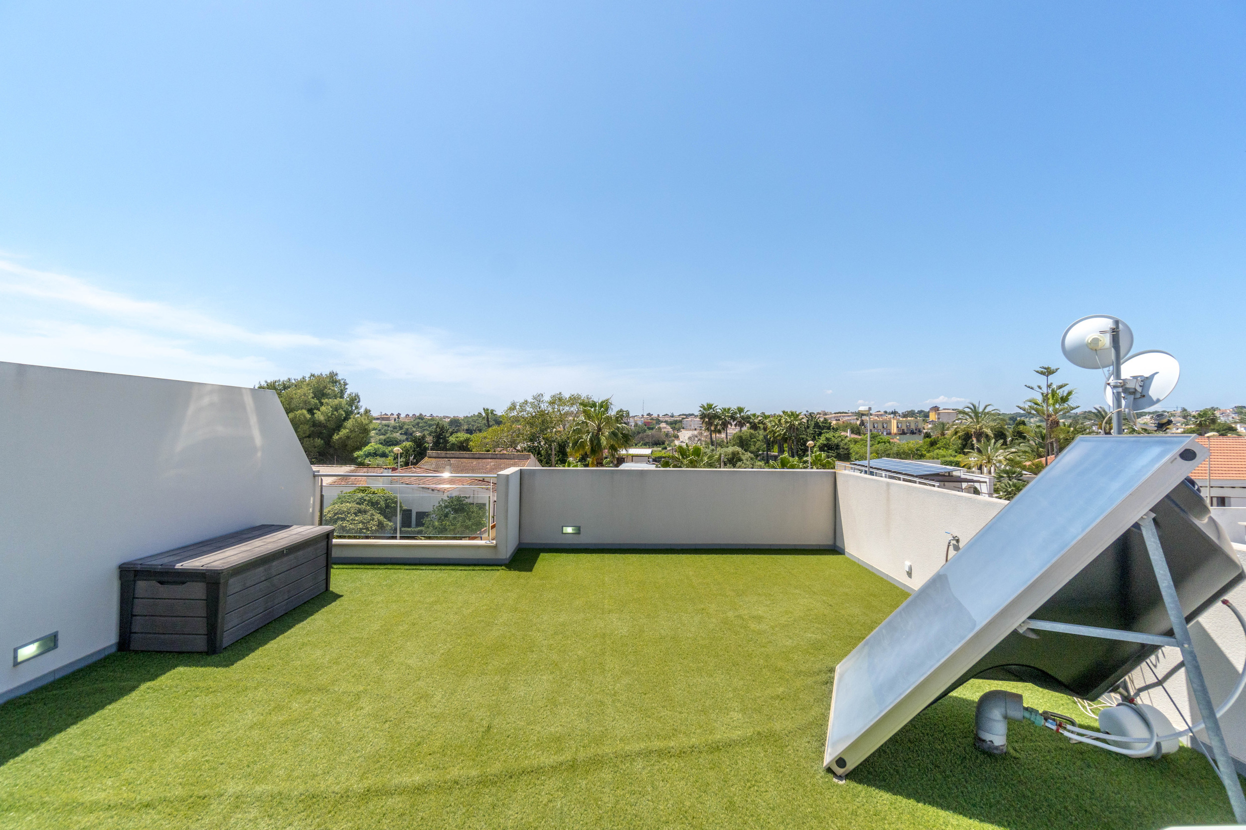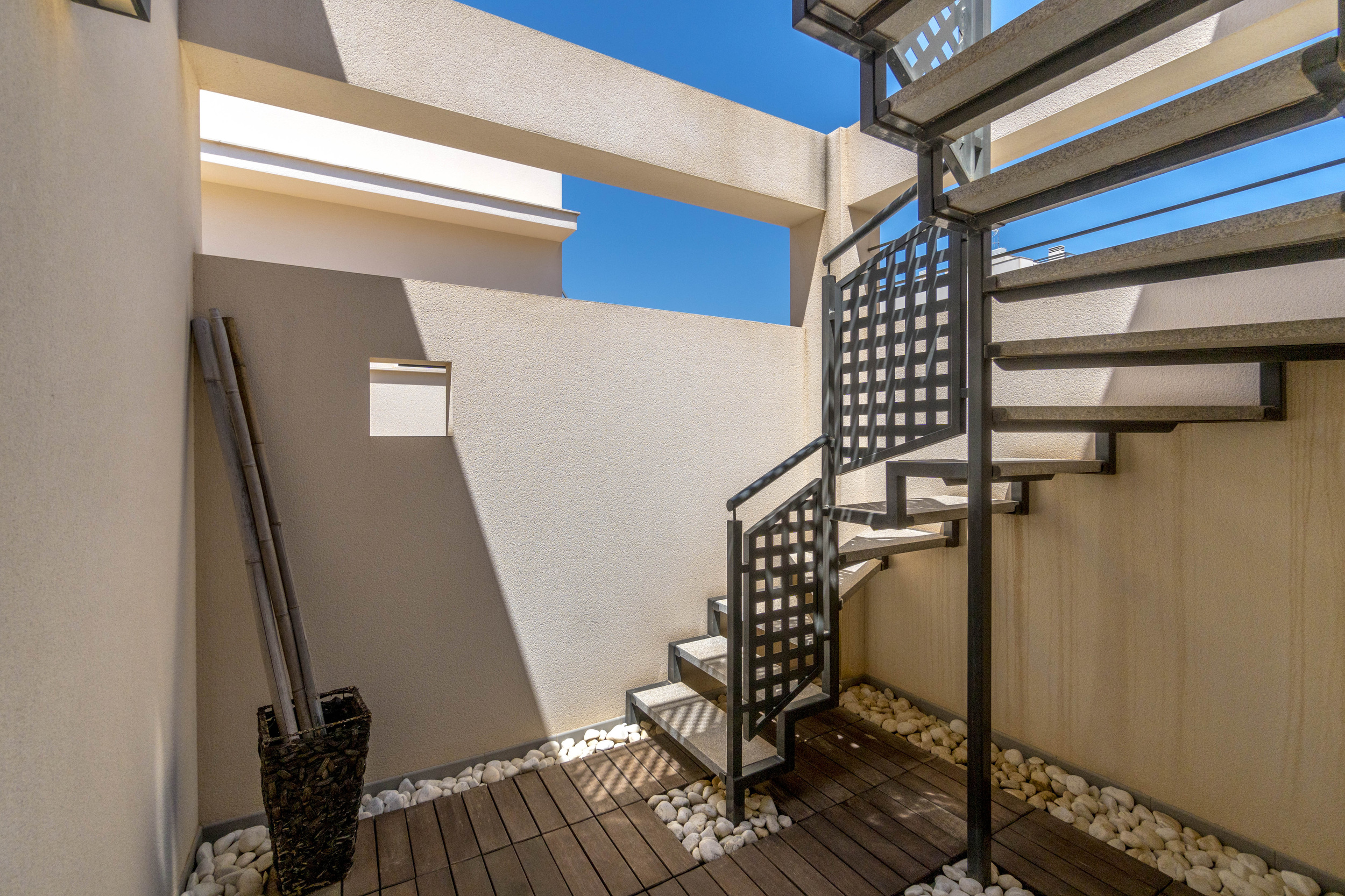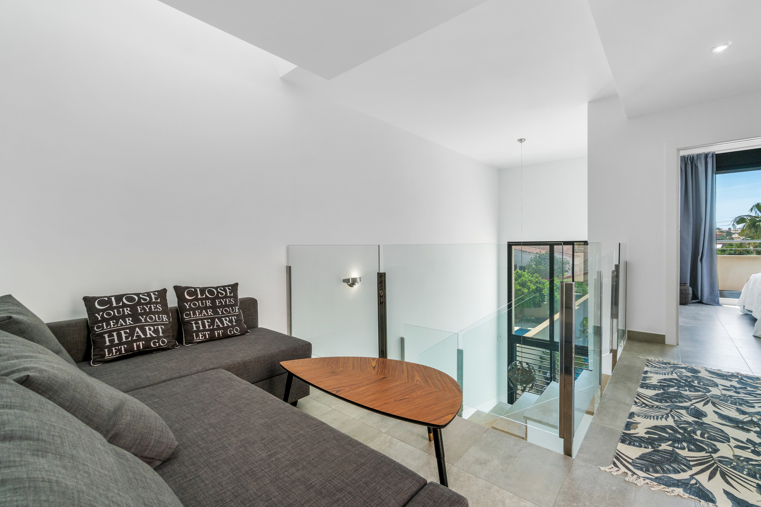 Huset har to etasjer samt stor takterrasse med utsikt over grøntområder og Middelhavet.