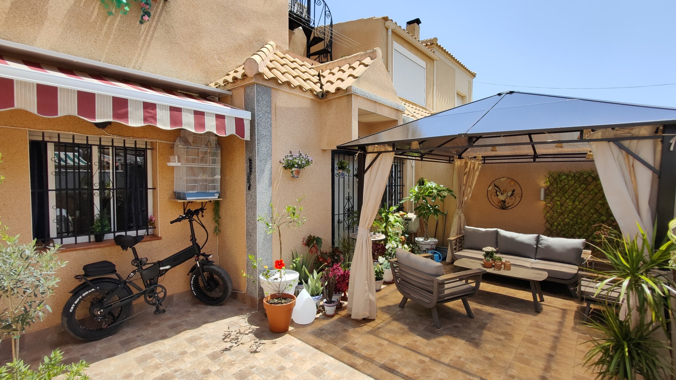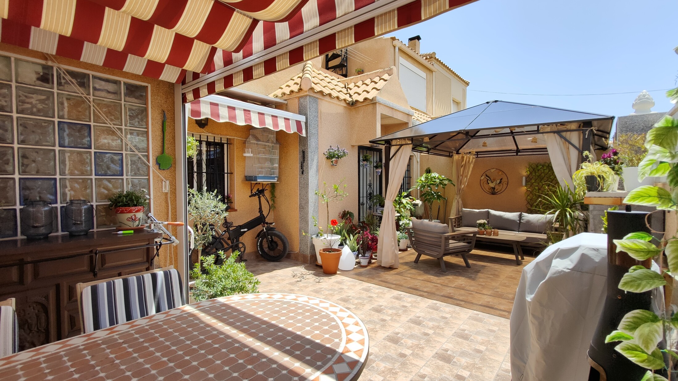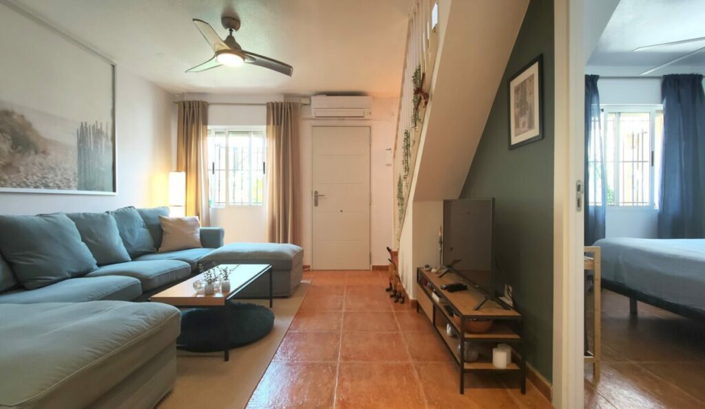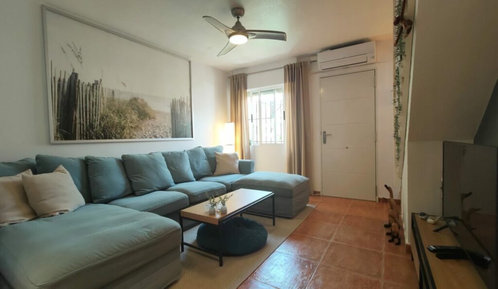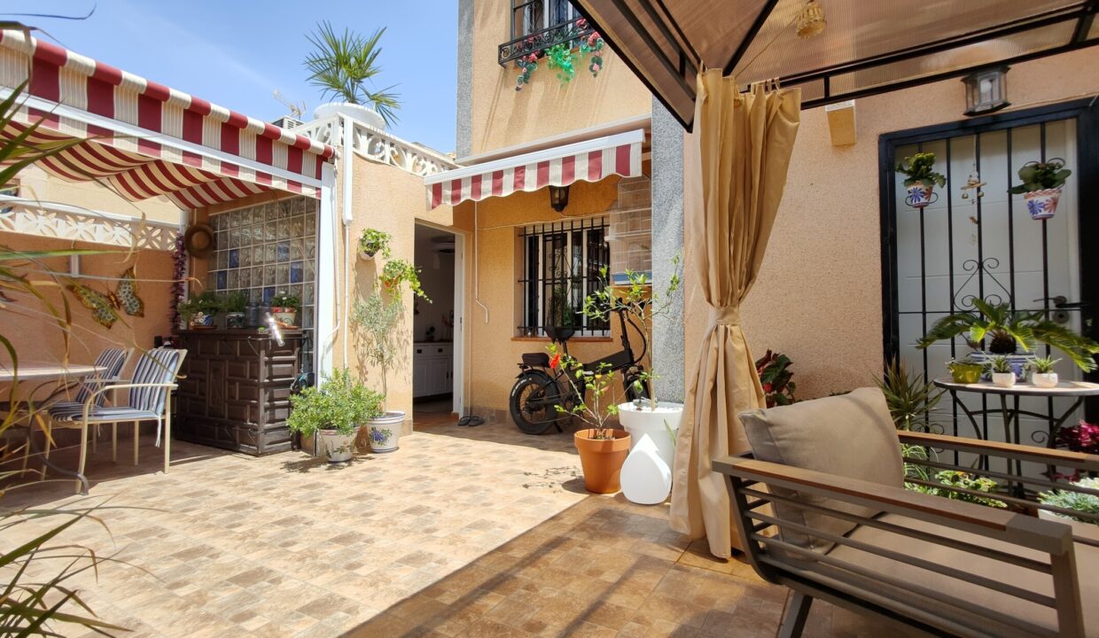 Vi er glade for å presentere denne vakre delvis renoverte tomannsboligen for salg i Jardín del Mar III – Torrevieja. Eiendommen ligger i en lukket urbanisasjon med et stort felles svømmebasseng omgitt av grønne områder.