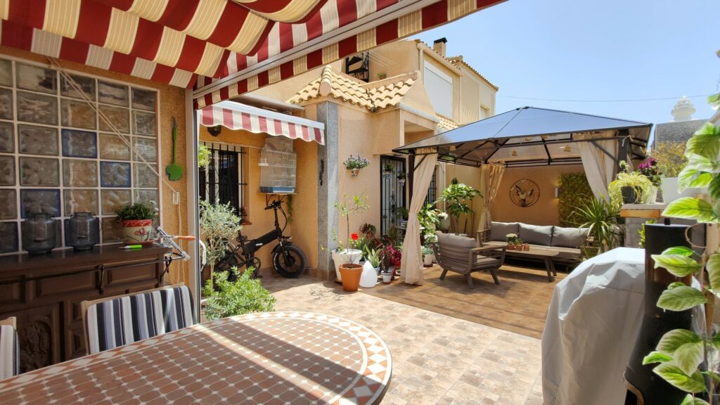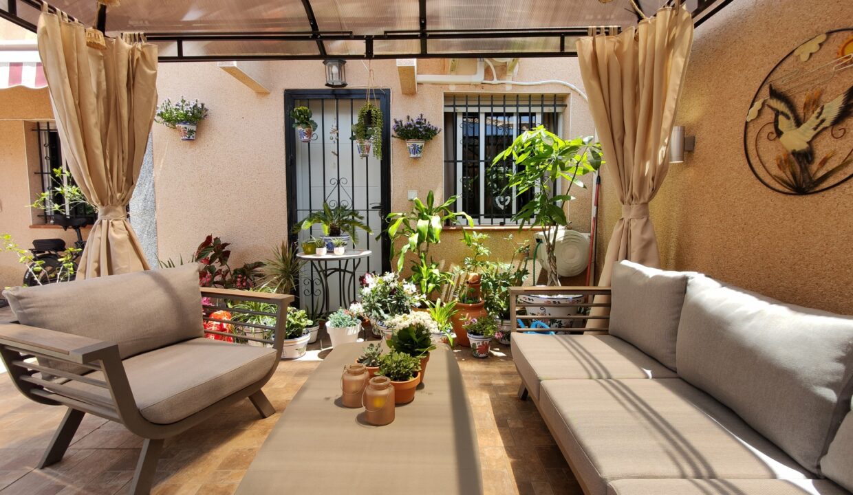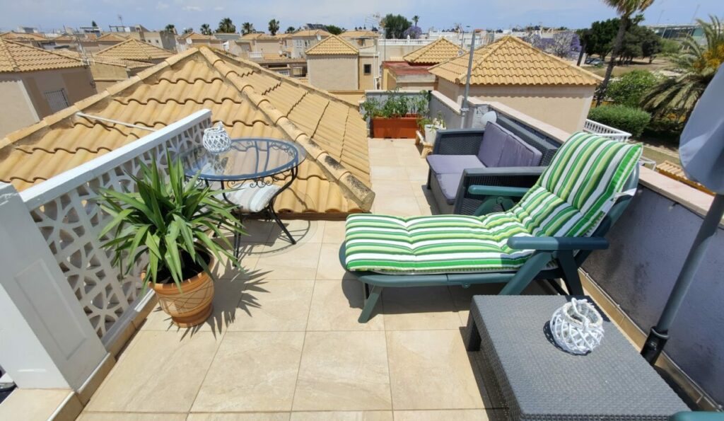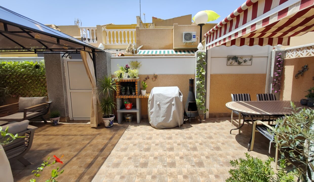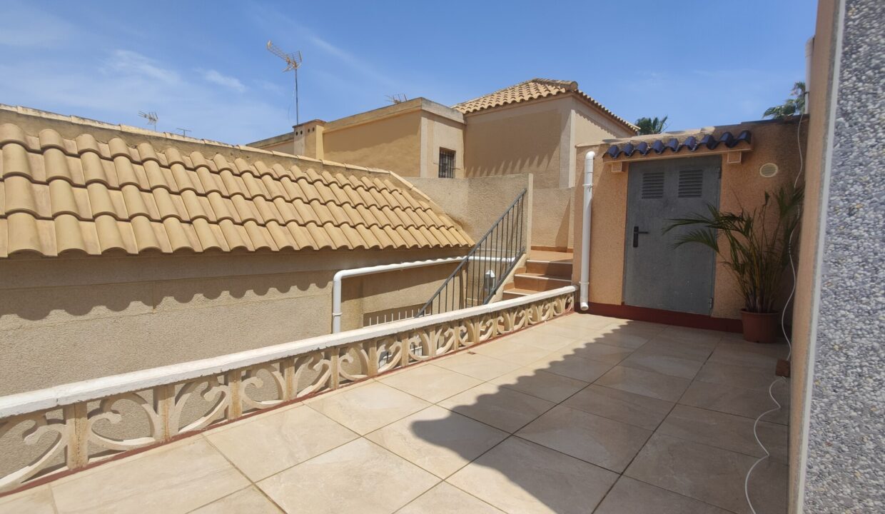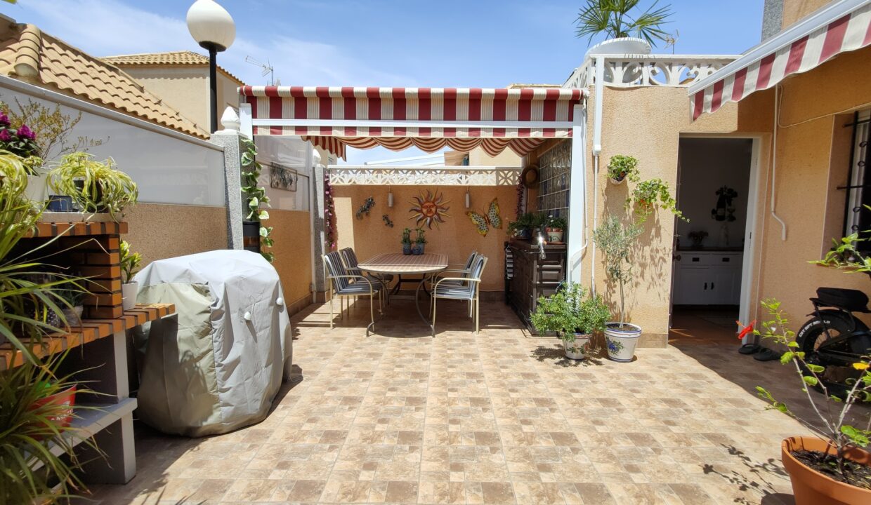 Vi er glade for å presentere denne vakre delvis renoverte tomannsboligen for salg i Jardín del Mar III – Torrevieja. Eiendommen ligger i en lukket urbanisasjon med et stort felles svømmebasseng omgitt av grønne områder.