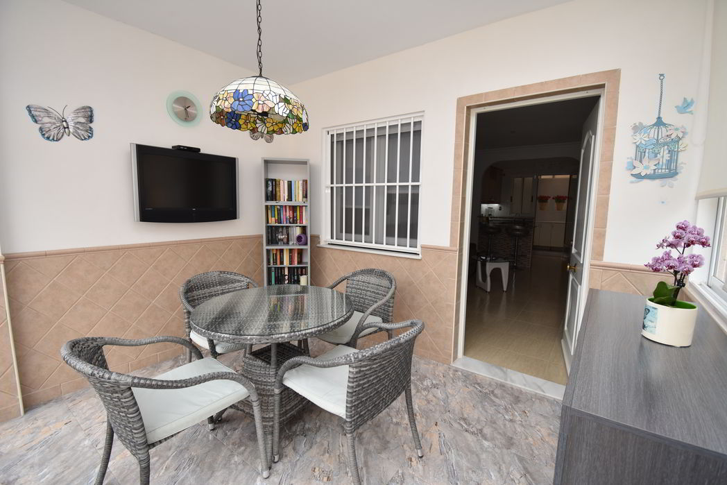 Uten for stuen er det også en innglasset veranda og hage hvor du har plass til bilen.
