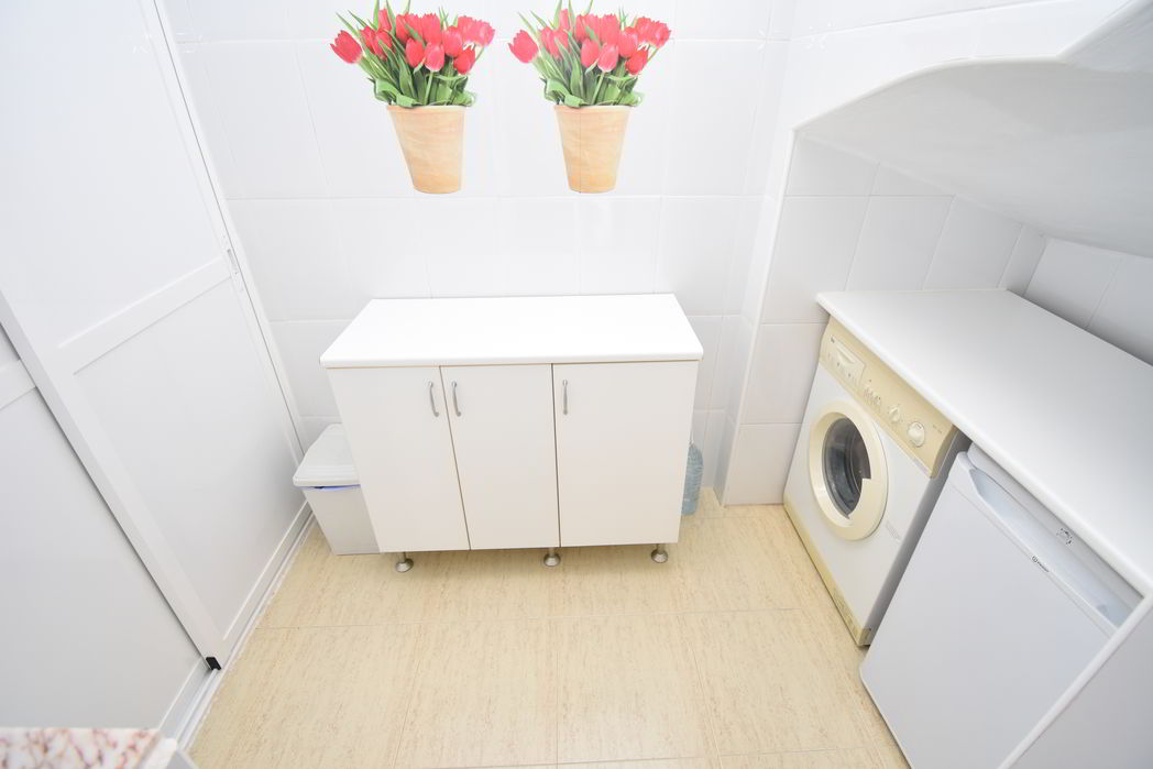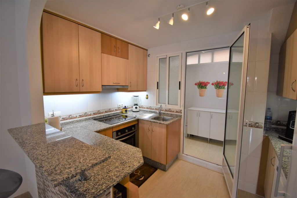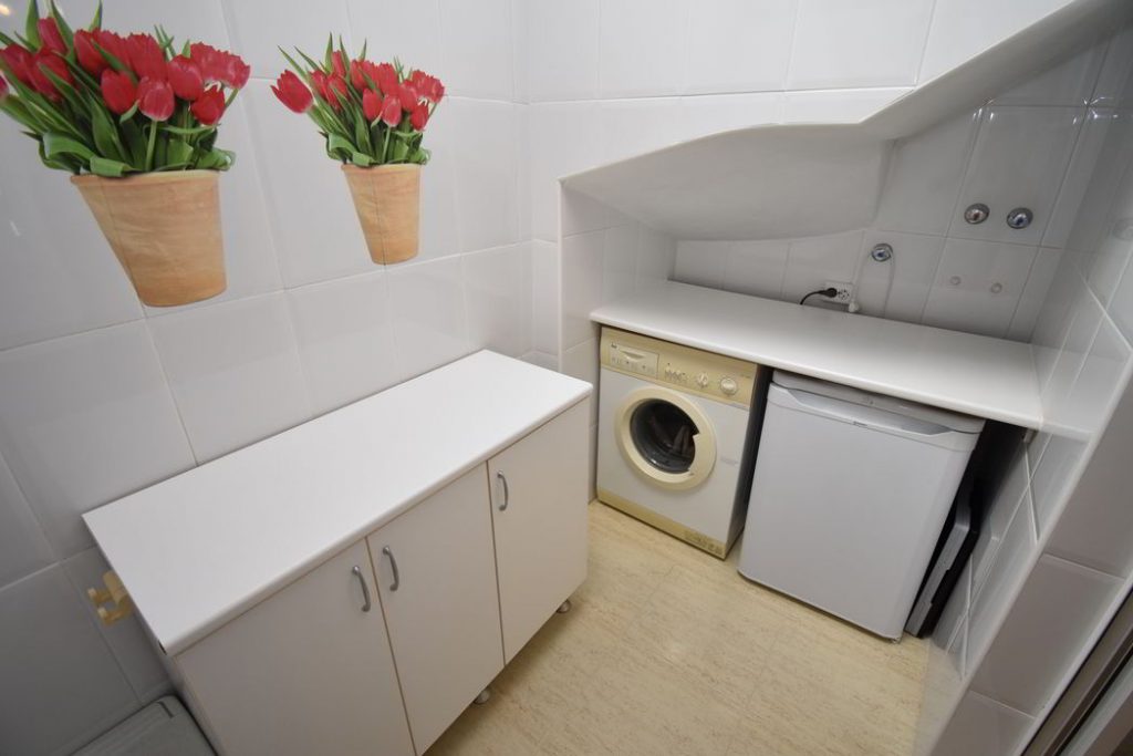 I første etasje er det en lys fin og romslig stue med åpen kjøkken løsning mot stuen, fullt utstyrt og møblert, ut fra kjøkkenet er det en patio/bod med lagringsplass og som også benyttes som vaskerom. Det er i tillegg et veldig romslig soverom og et bad, alt fullstendig renovert og i utmerket stand.