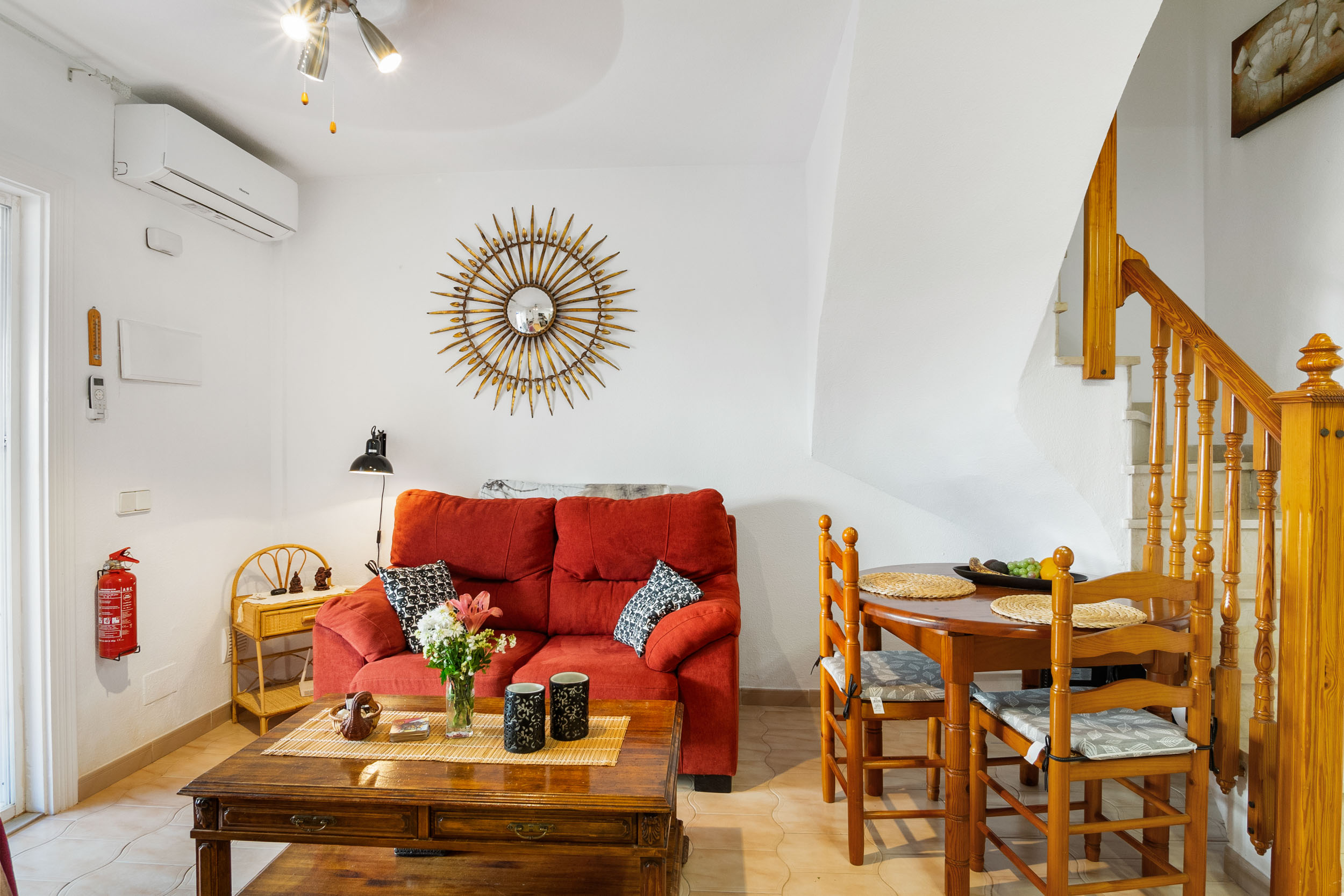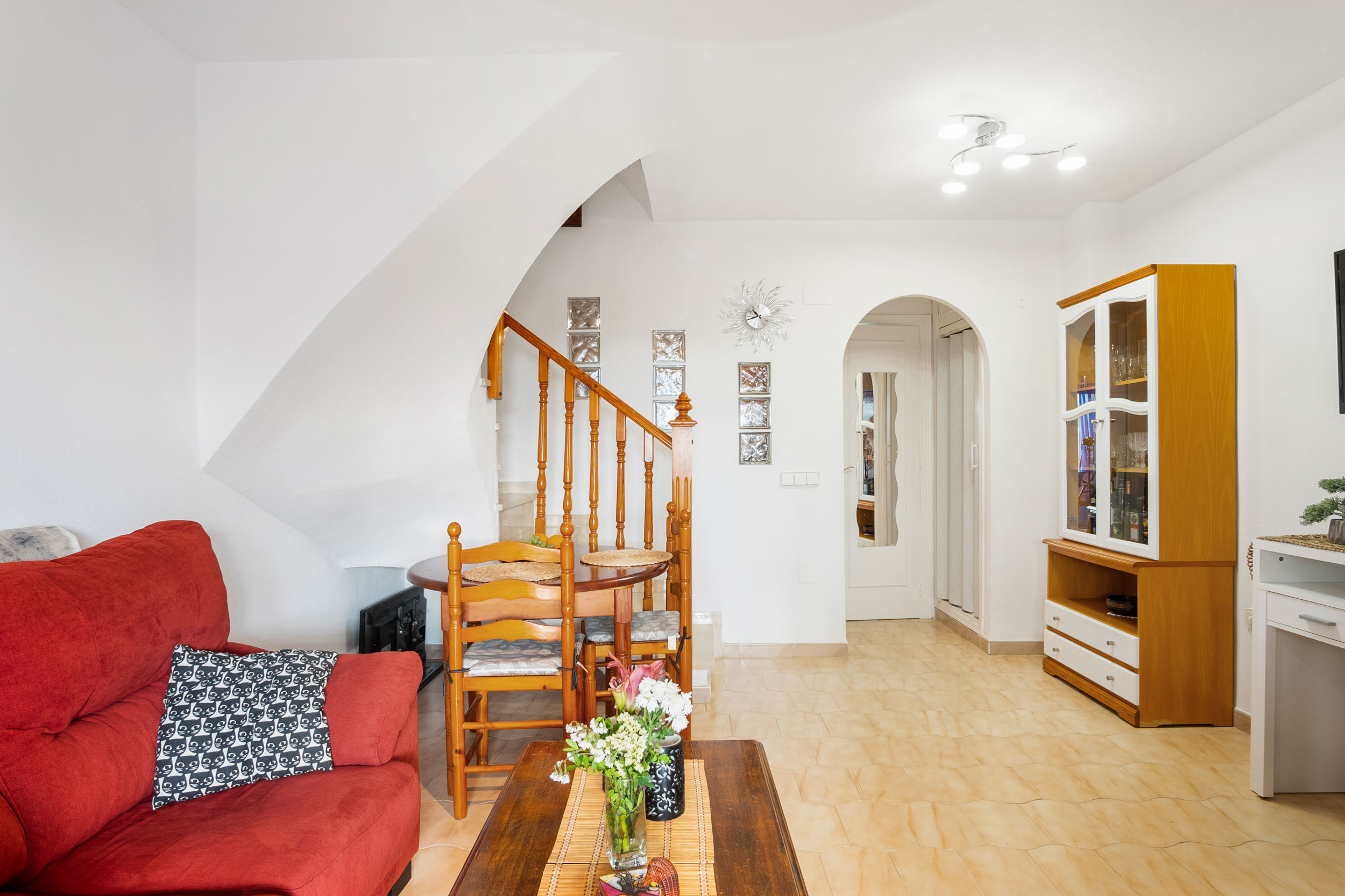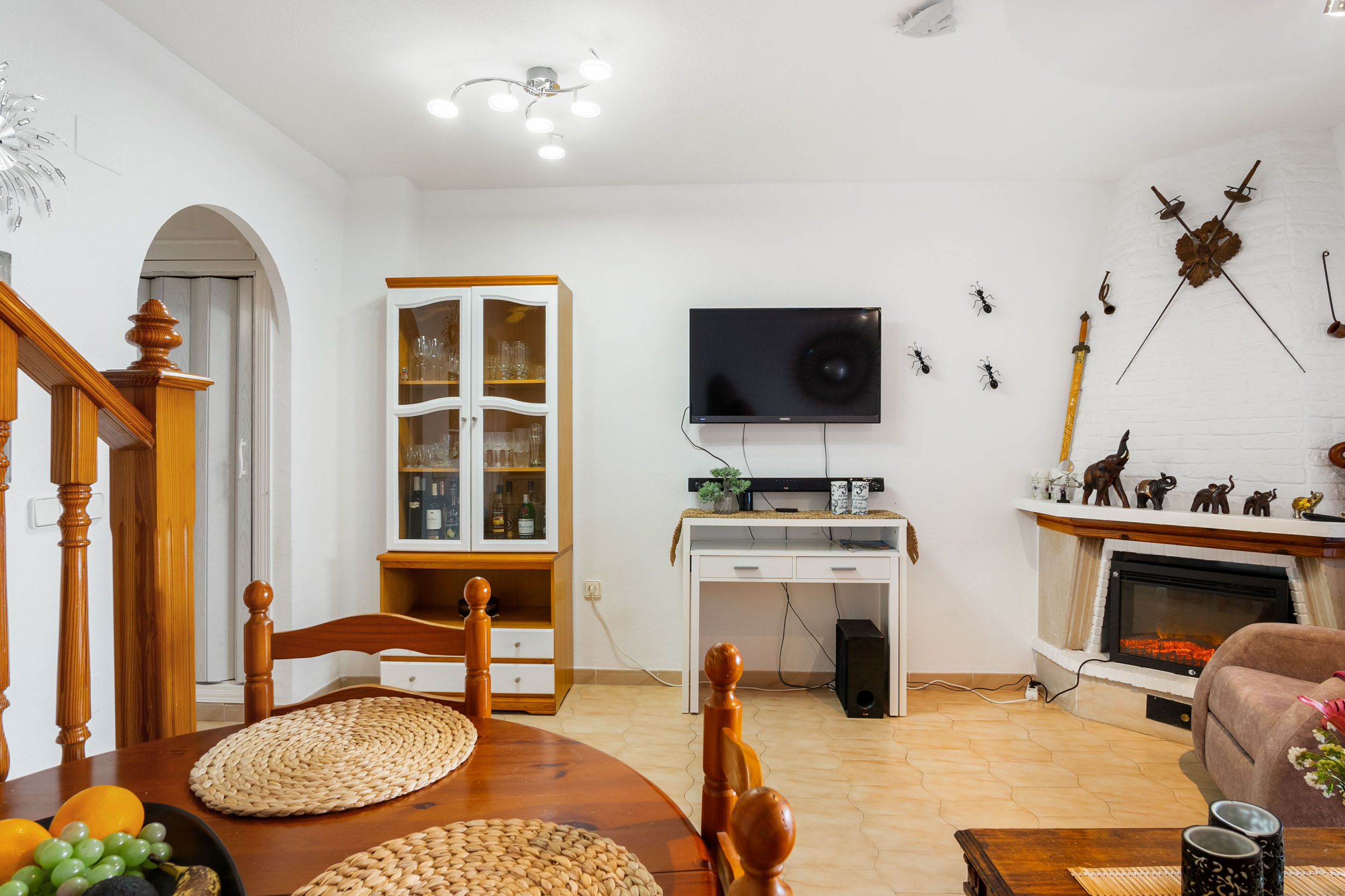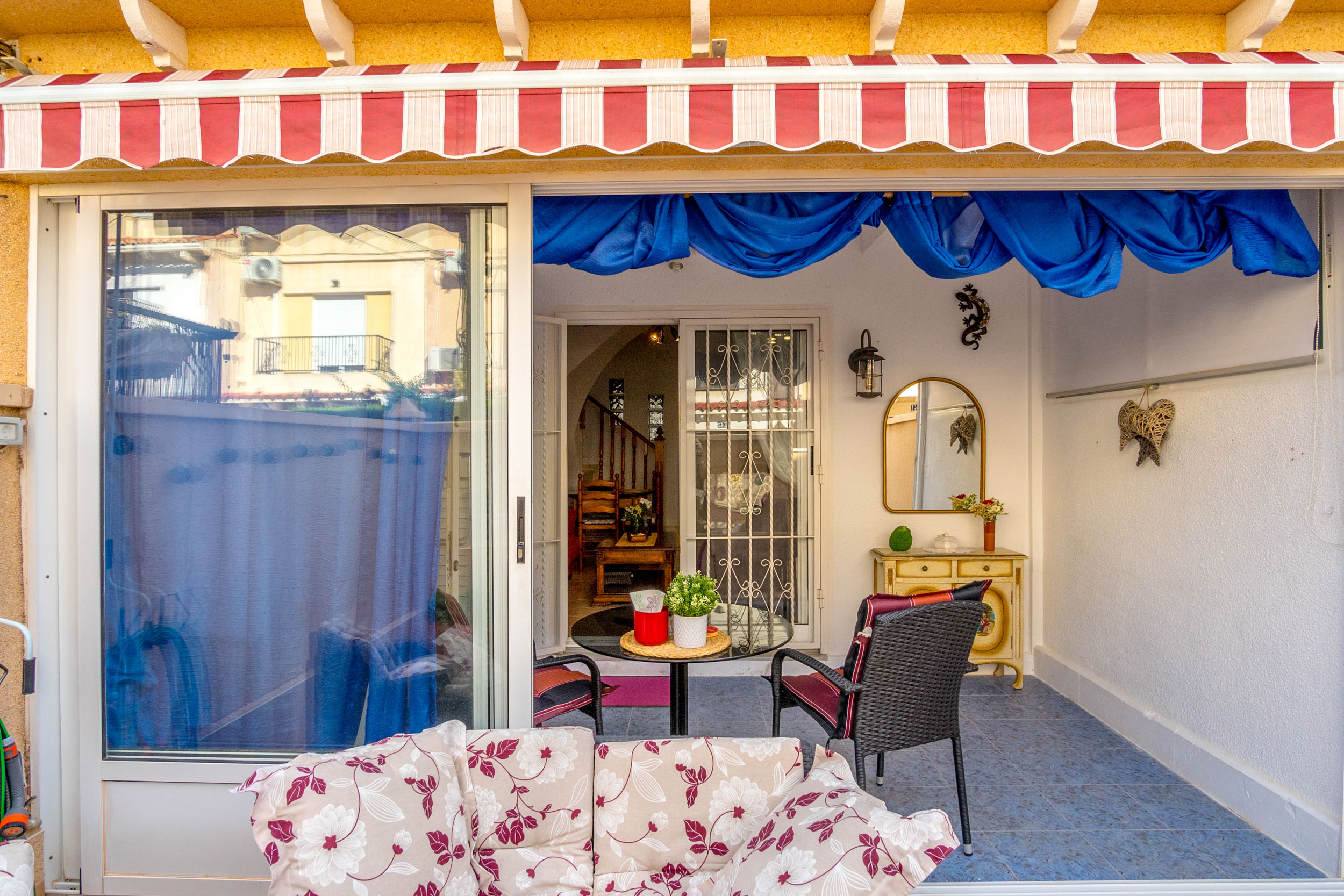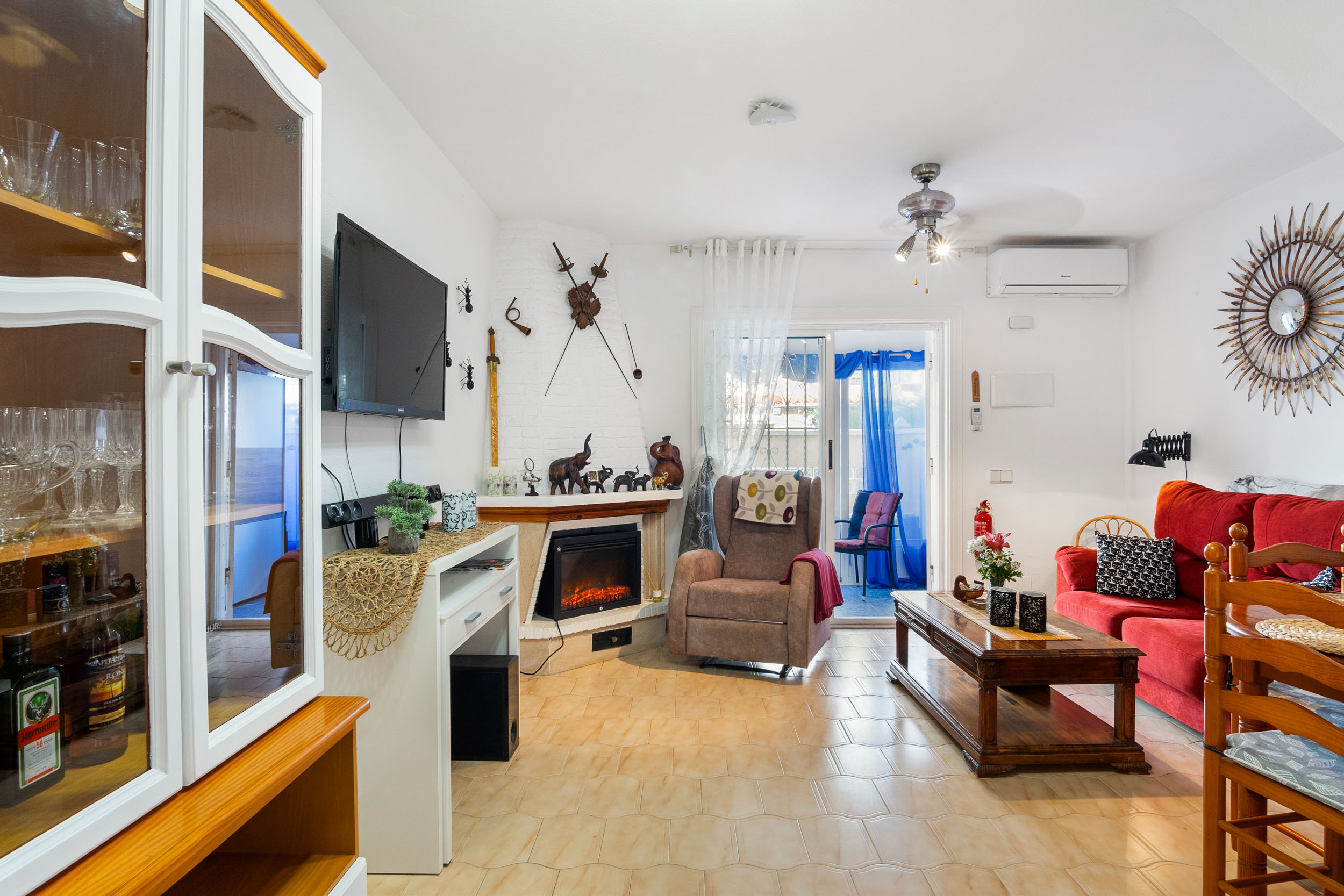 Inn porten er det en hyggelig flislagt hage og en innlgasset terrasse. Videre kommer du inn i stuen hvor det er aircondition og peis. Det er et toalett og kjøkkenet med utgang til patioen med vaskerom.