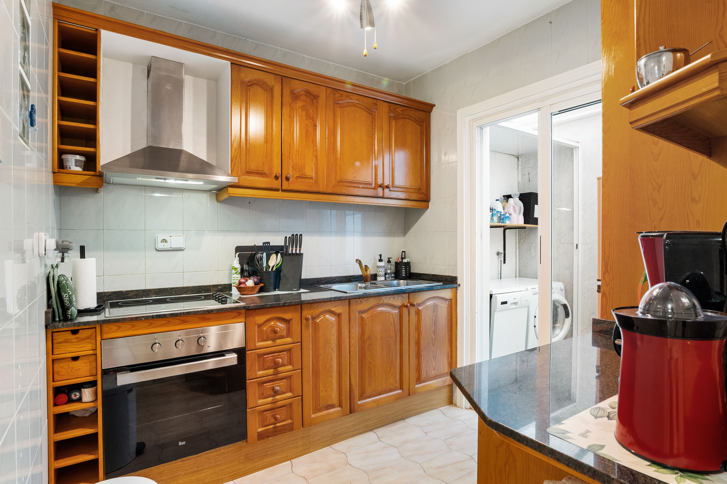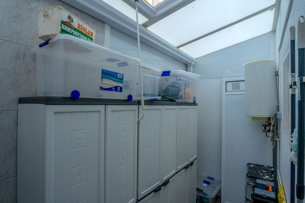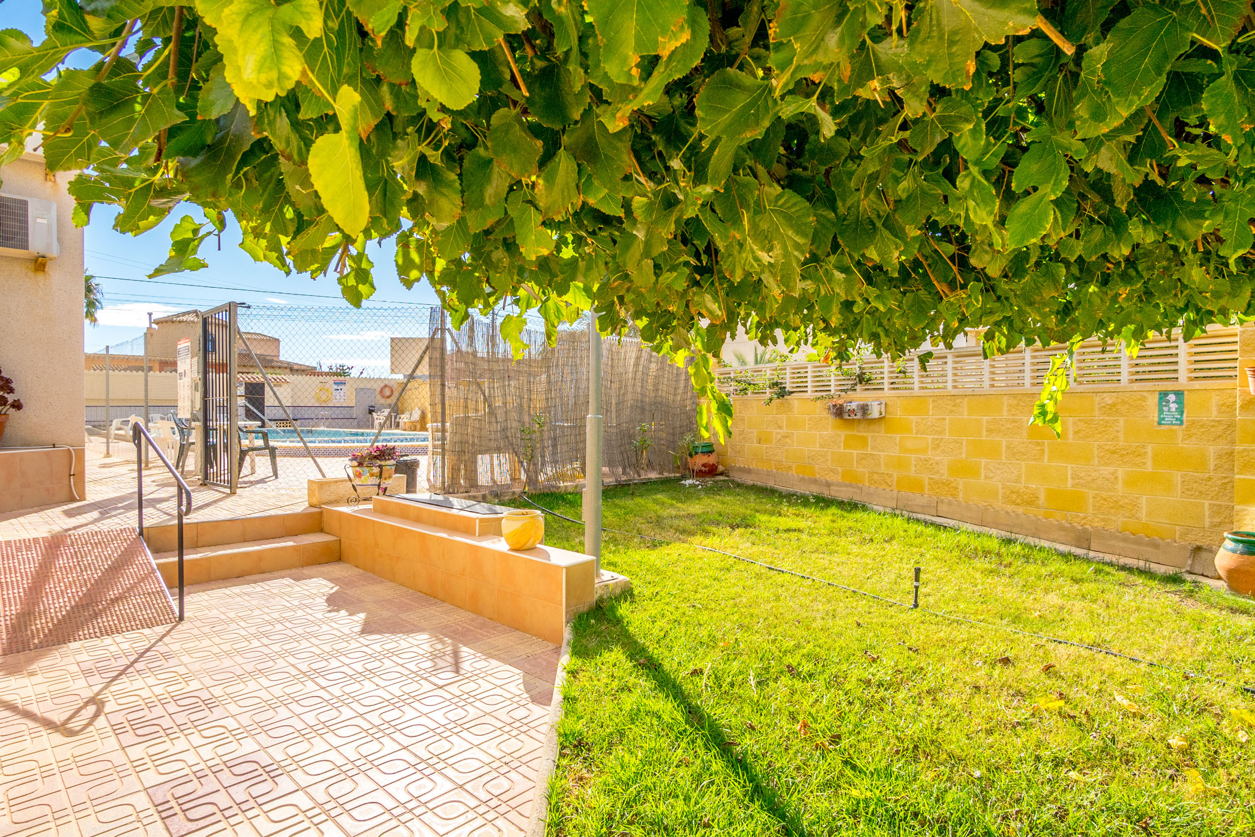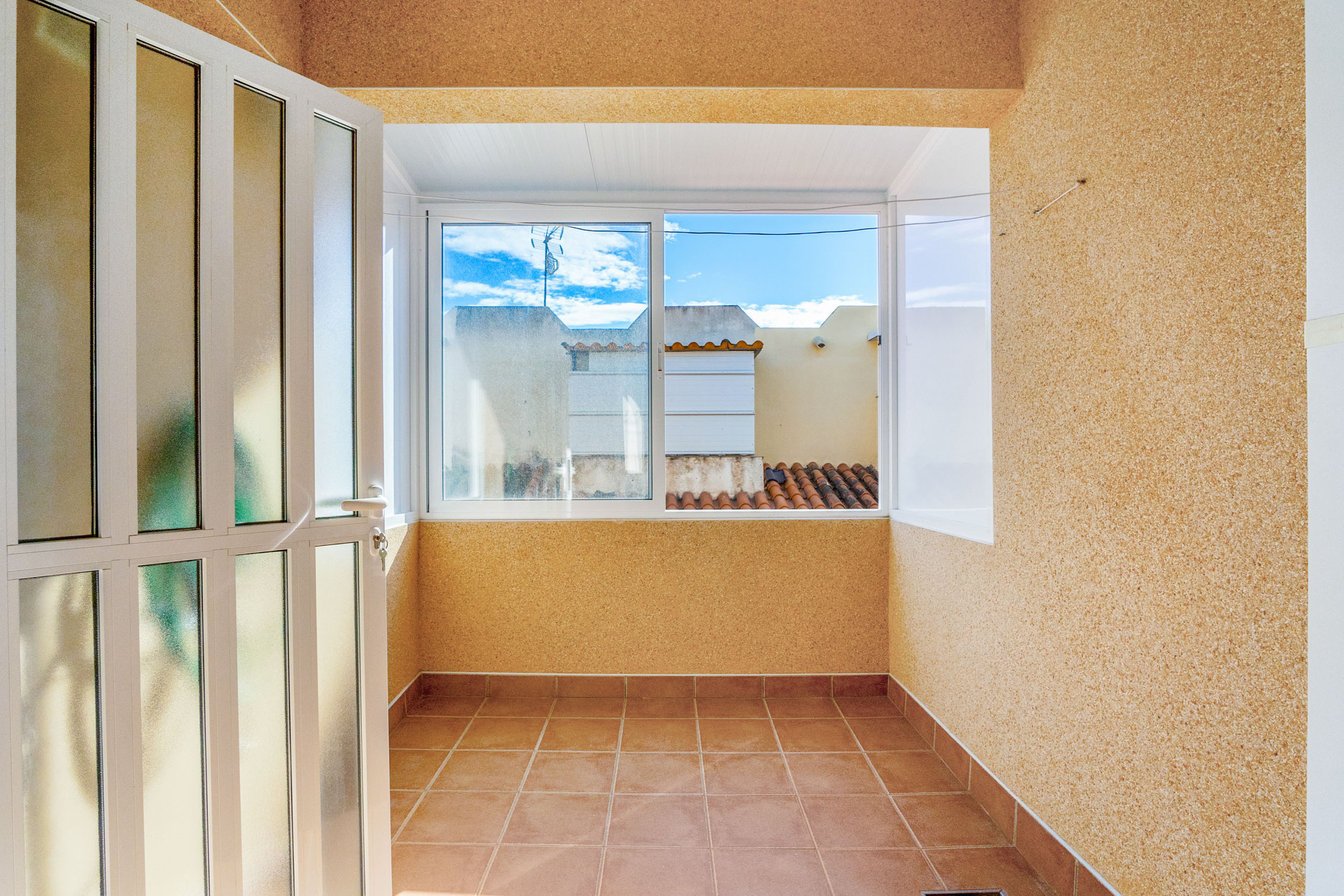 Inn porten er det en hyggelig flislagt hage og en innlgasset terrasse. Videre kommer du inn i stuen hvor det er aircondition og peis. Det er et toalett og kjøkkenet med utgang til patioen med vaskerom.