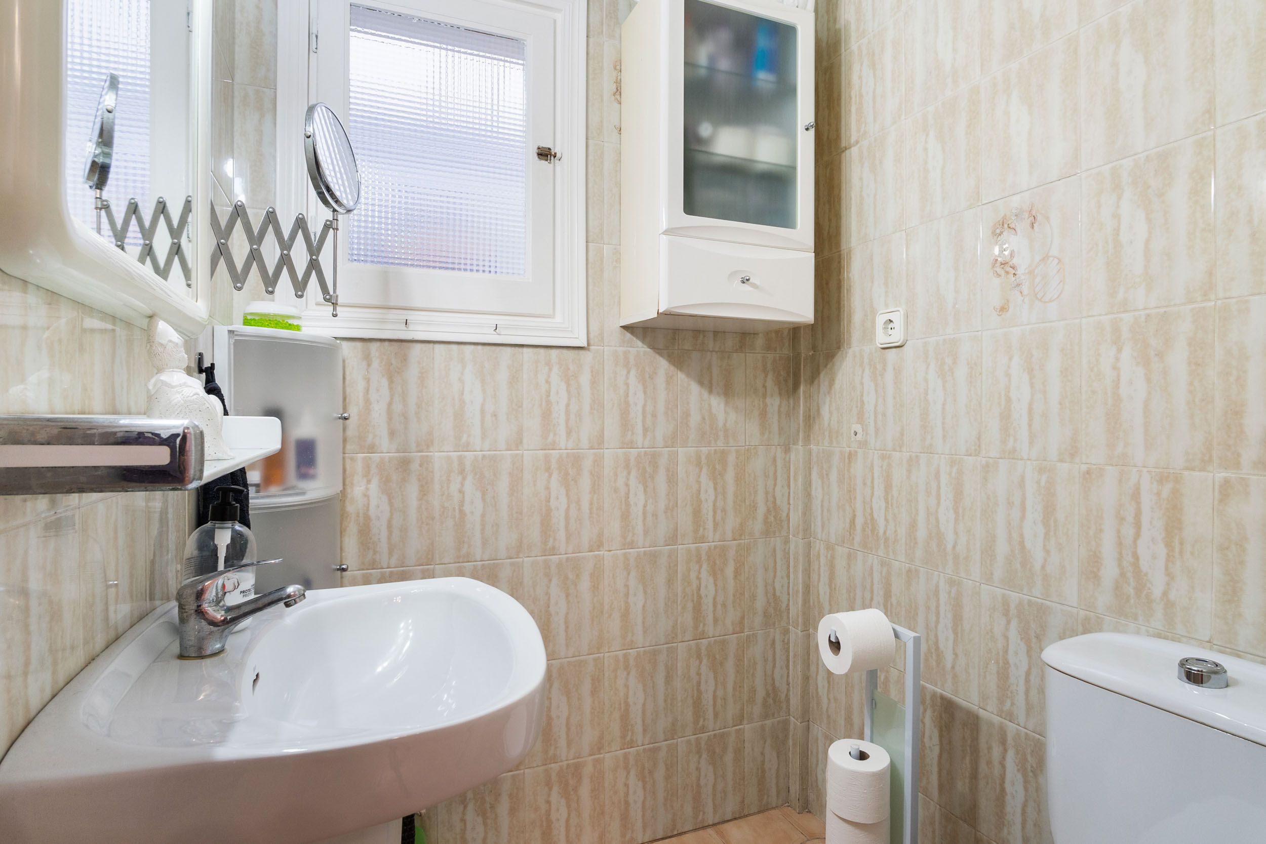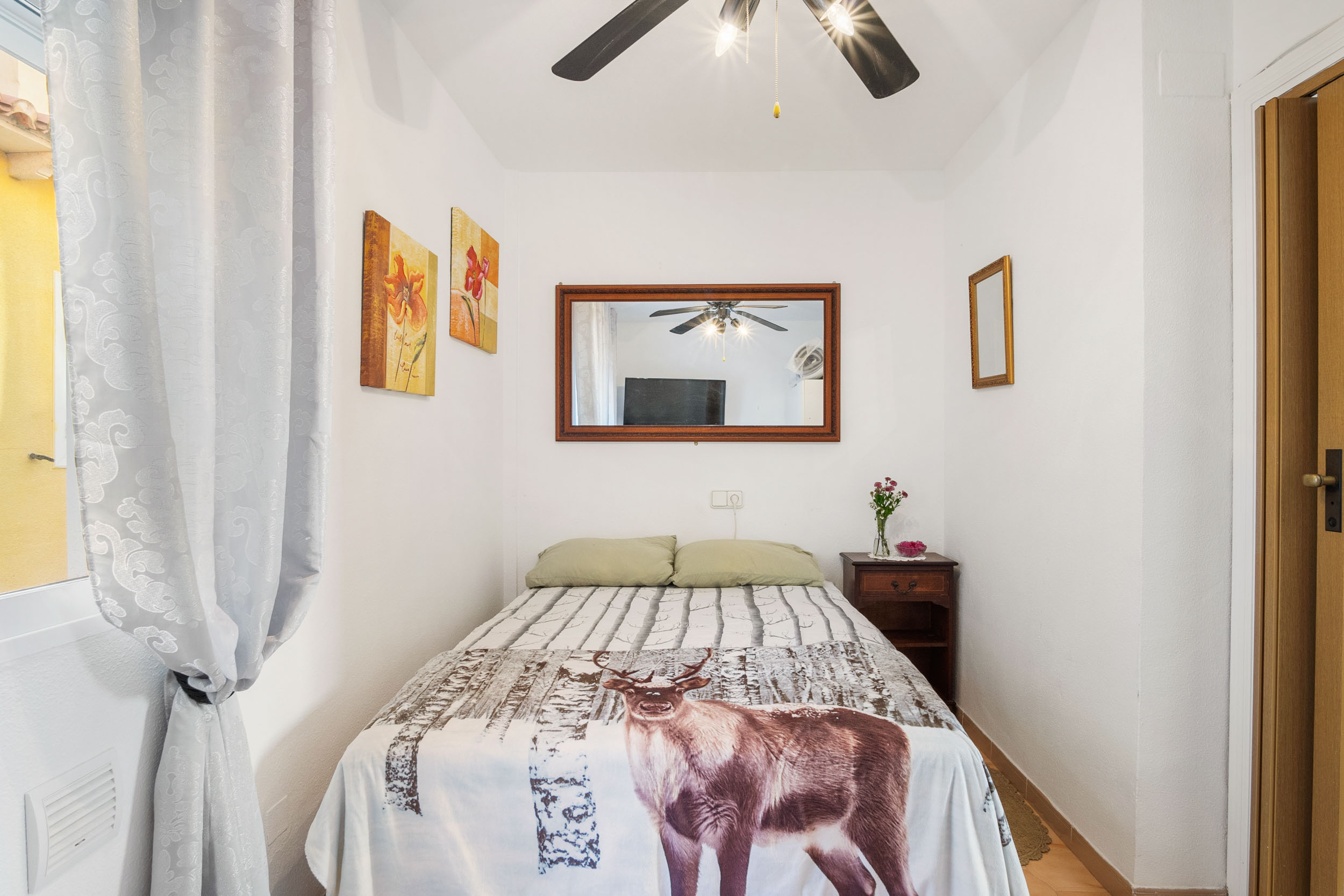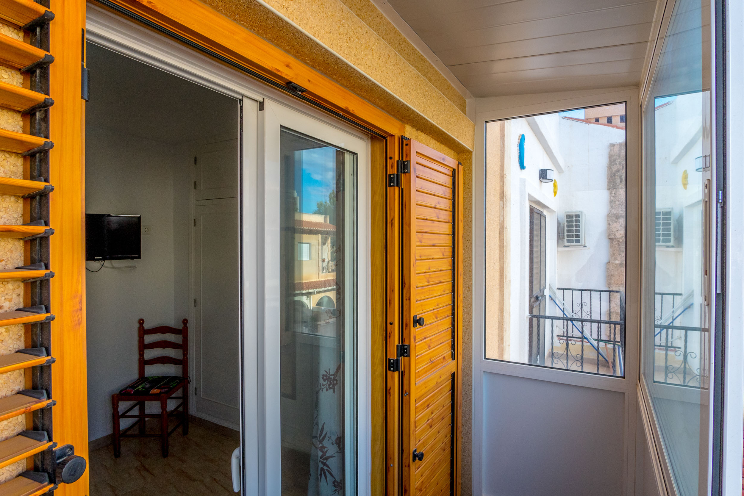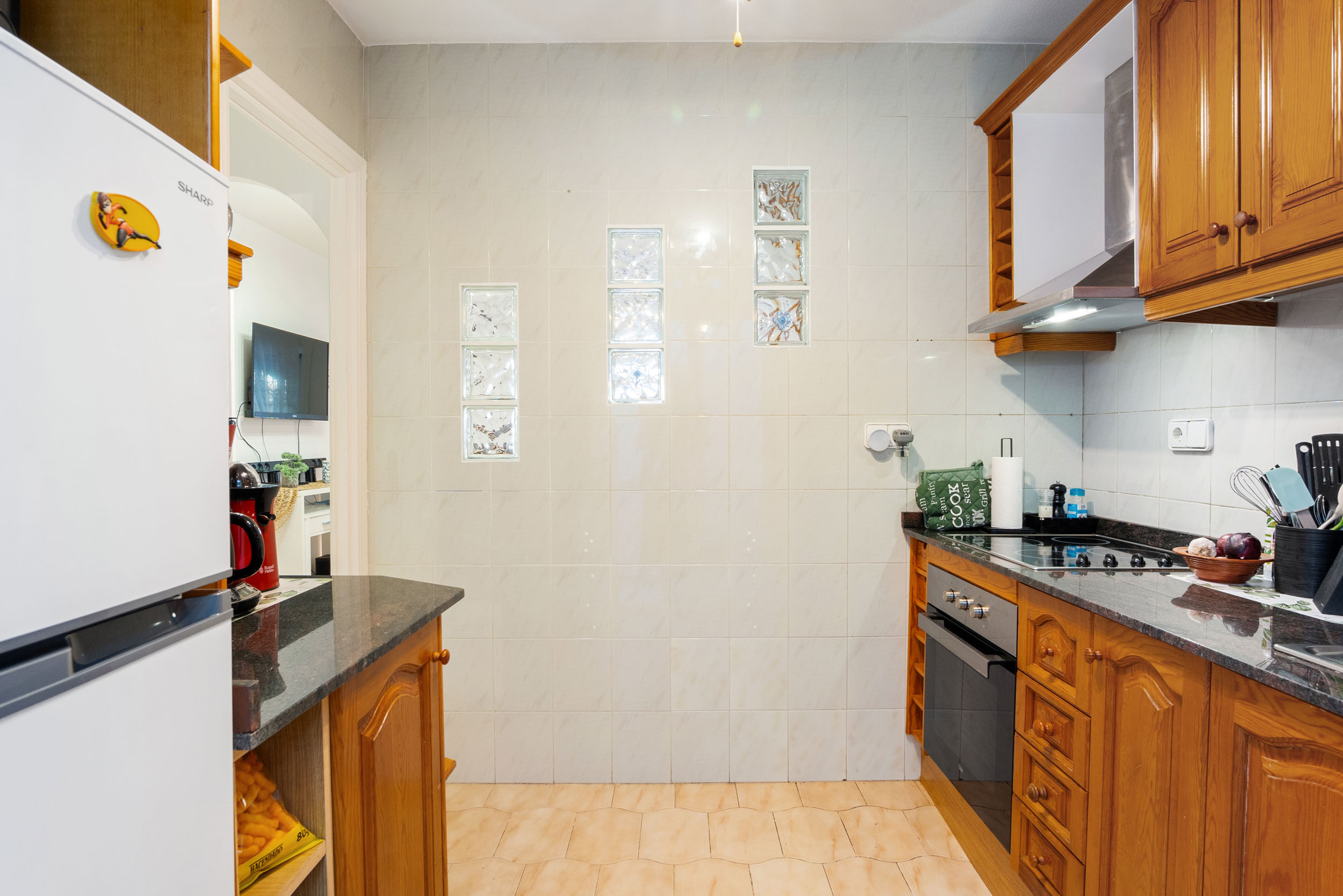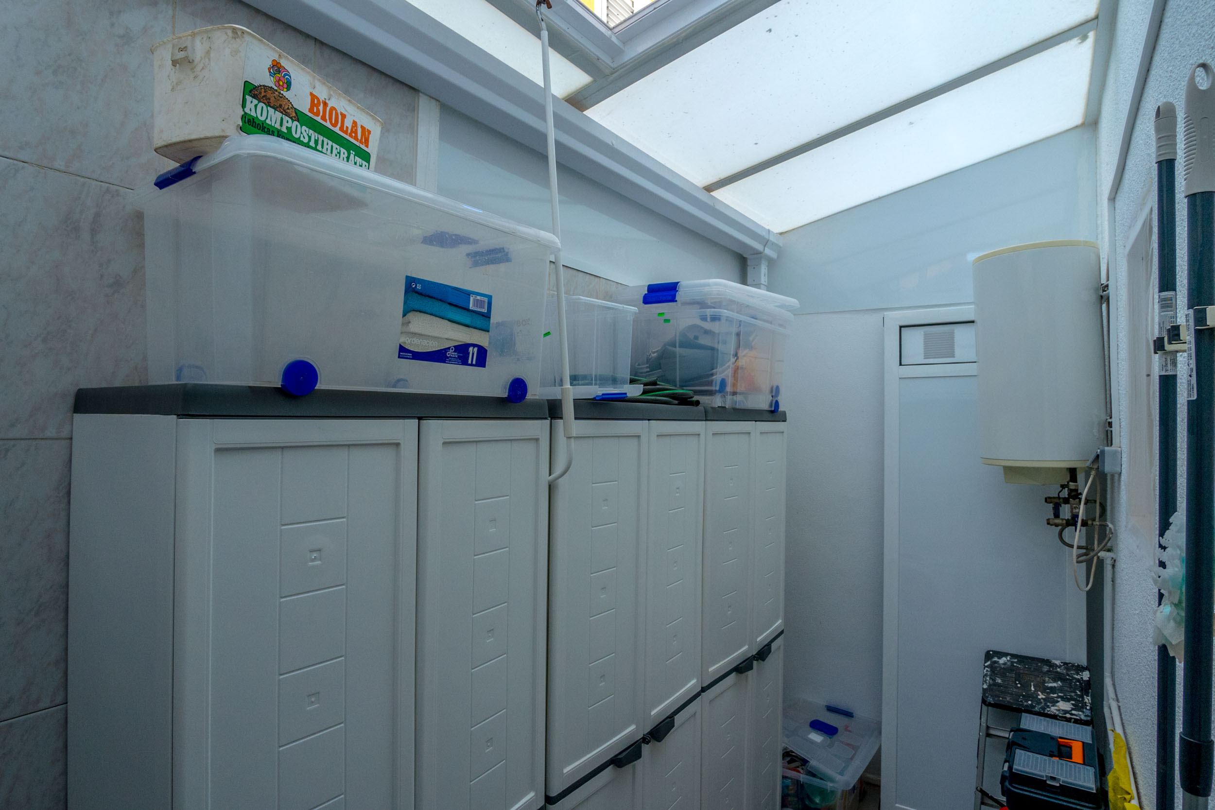 Inn porten er det en hyggelig flislagt hage og en innlgasset terrasse. Videre kommer du inn i stuen hvor det er aircondition og peis. Det er et toalett og kjøkkenet med utgang til patioen med vaskerom.