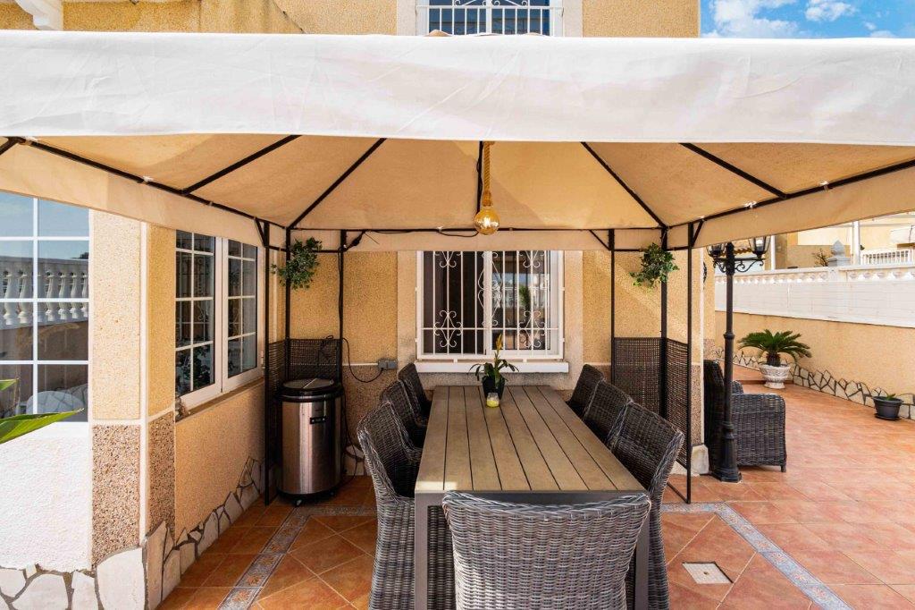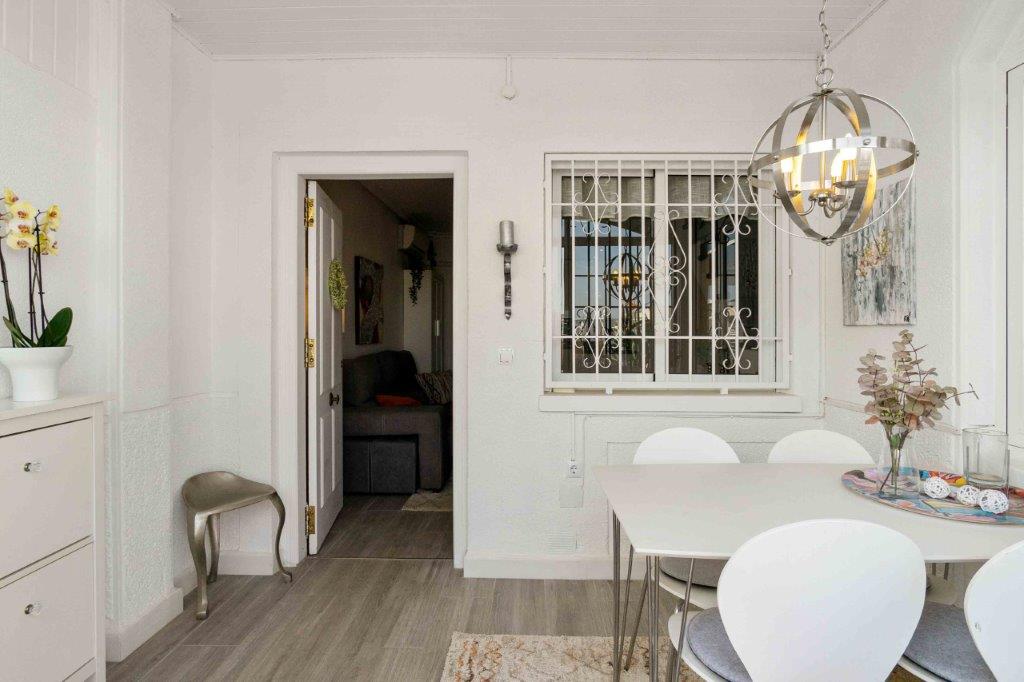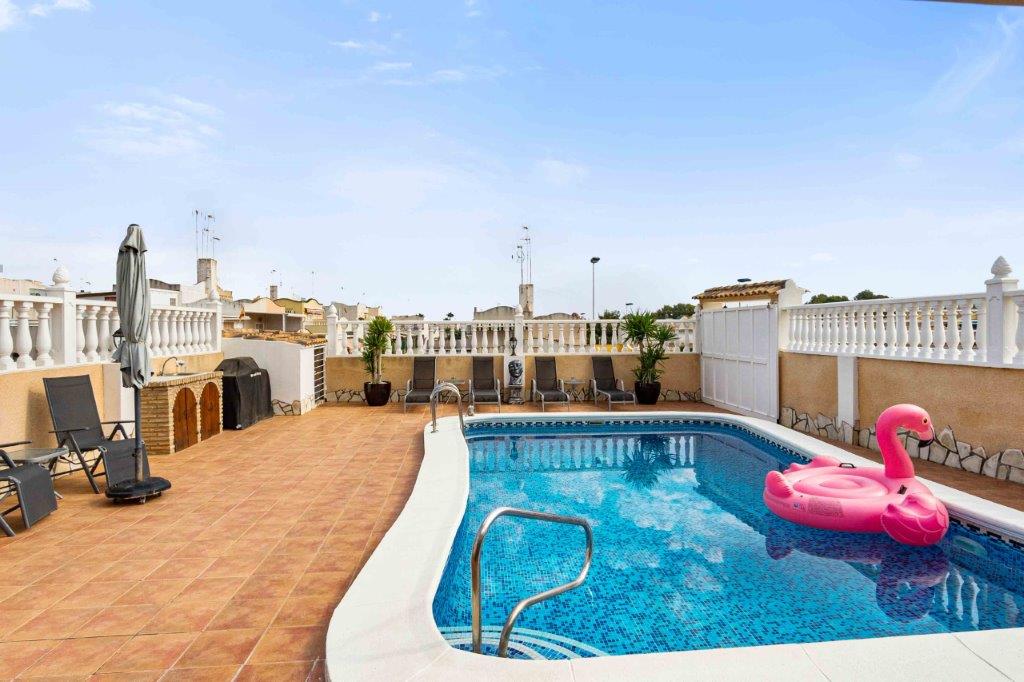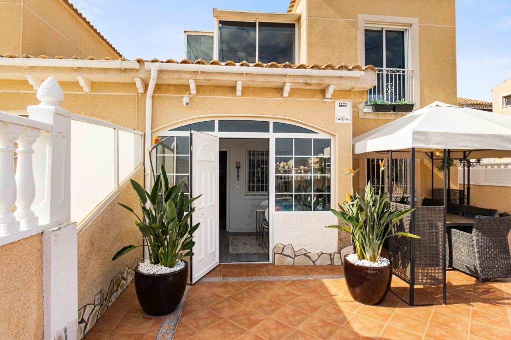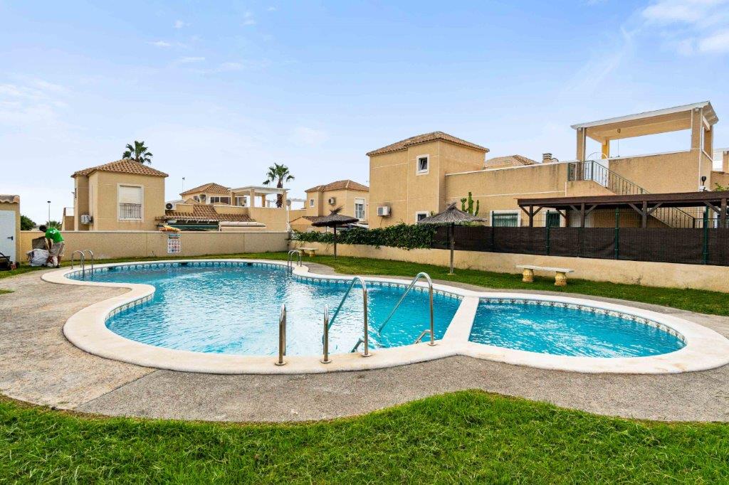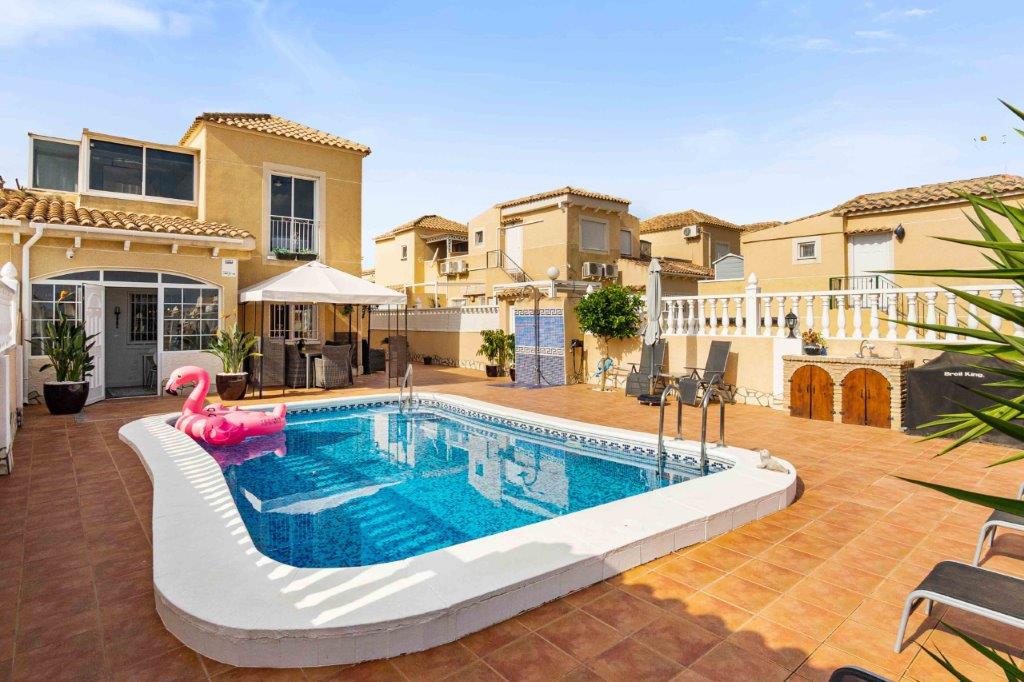 Dette fine rekkehuset på 70 m2 ligger på et hjørne og har en stor flislagt hage på 84 m2 med et privat basseng. Her er det også en fin pergola.