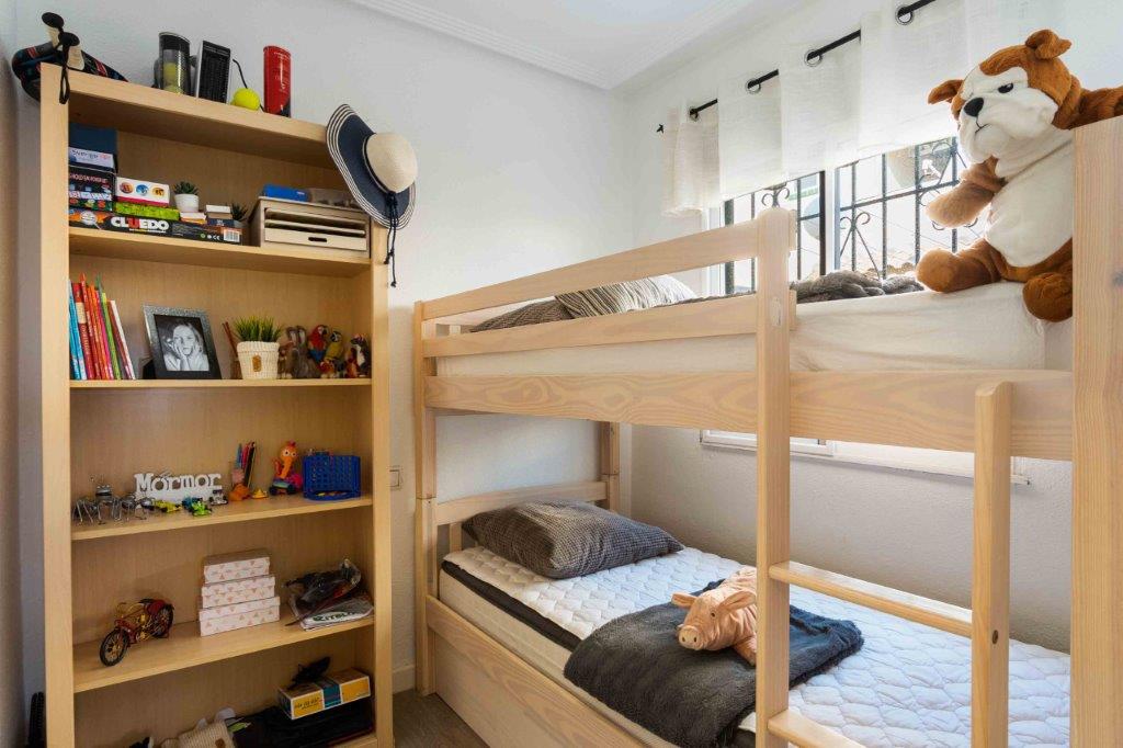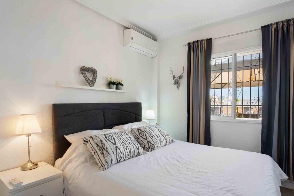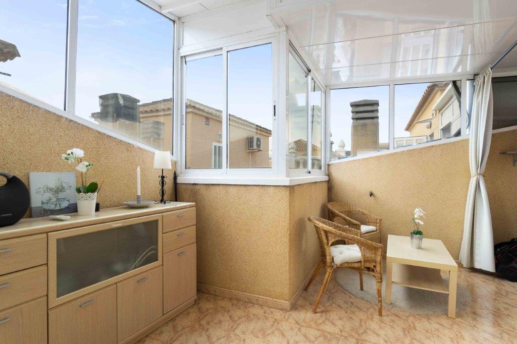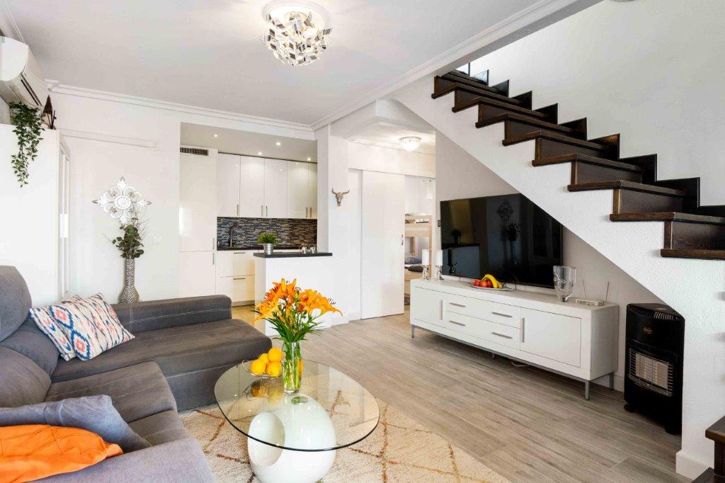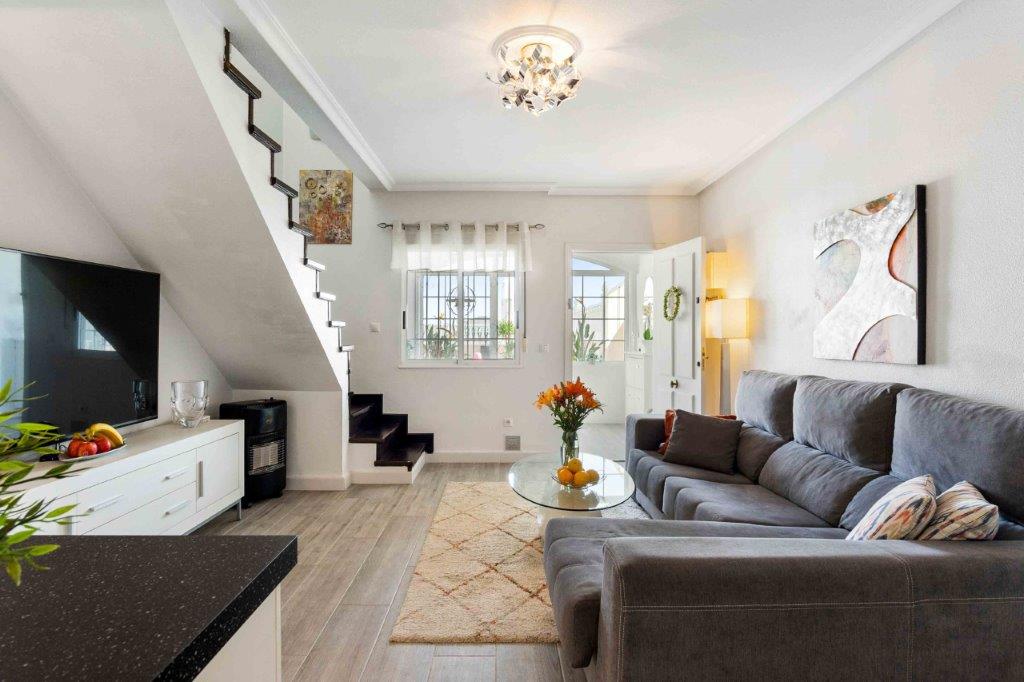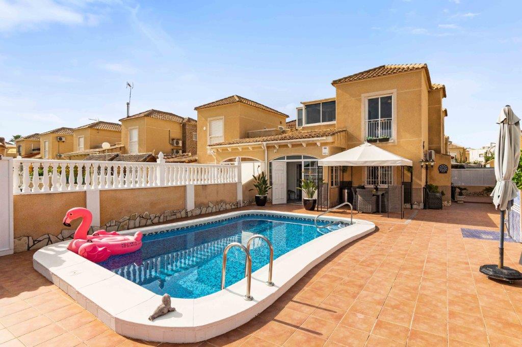 Dette fine rekkehuset på 70 m2 ligger på et hjørne og har en stor flislagt hage på 84 m2 med et privat basseng. Her er det også en fin pergola.