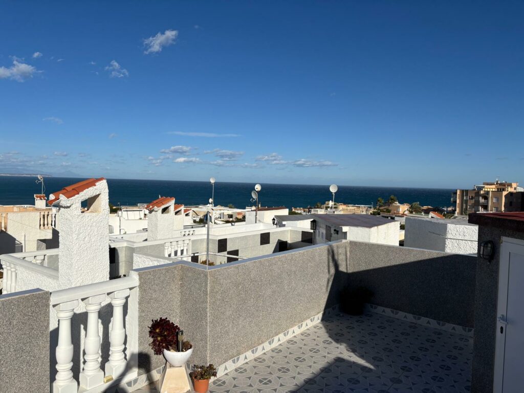 Velkommen til populære La Provenza i Torrevieja! Her finner du et svært trivelig rekkehus med hage, balkong og stor takterrasse med havutsikt – perfekt både som feriebolig og helårsbolig.