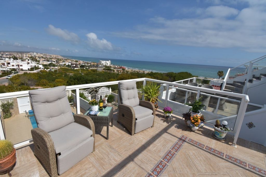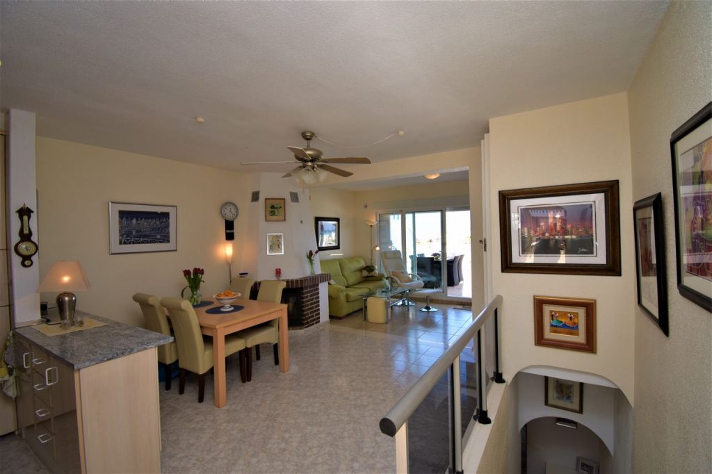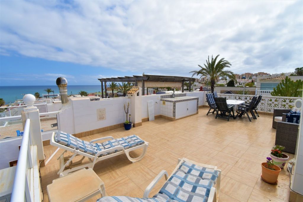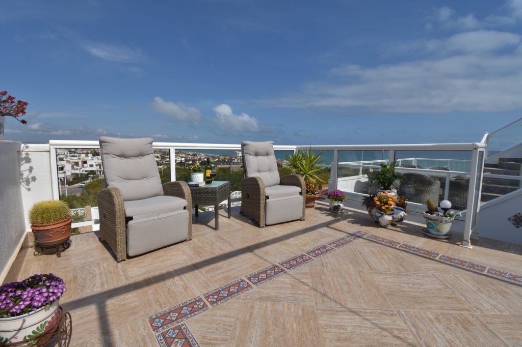 Fra stuen kan du gå ut til en stor terrasse hvor du kan nyte den fantastiske utsikten mot Middelhavet og stranden.