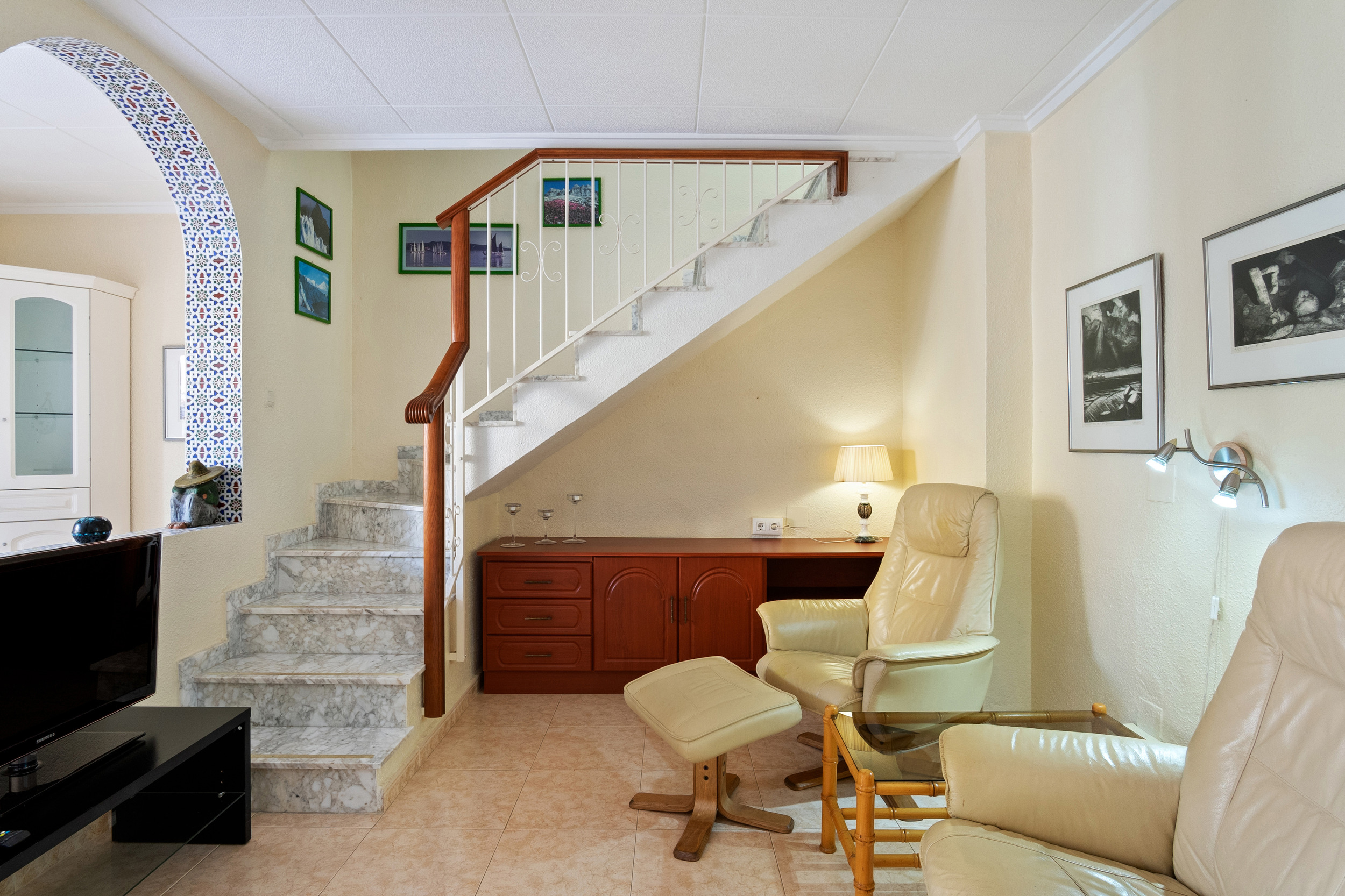 Inn porten er det en liten hyggelig flislagt uteplass. Deretter går du inn i den store stuen og videre inn er kjøkkenet med galleri, et soverom og 1 bad.