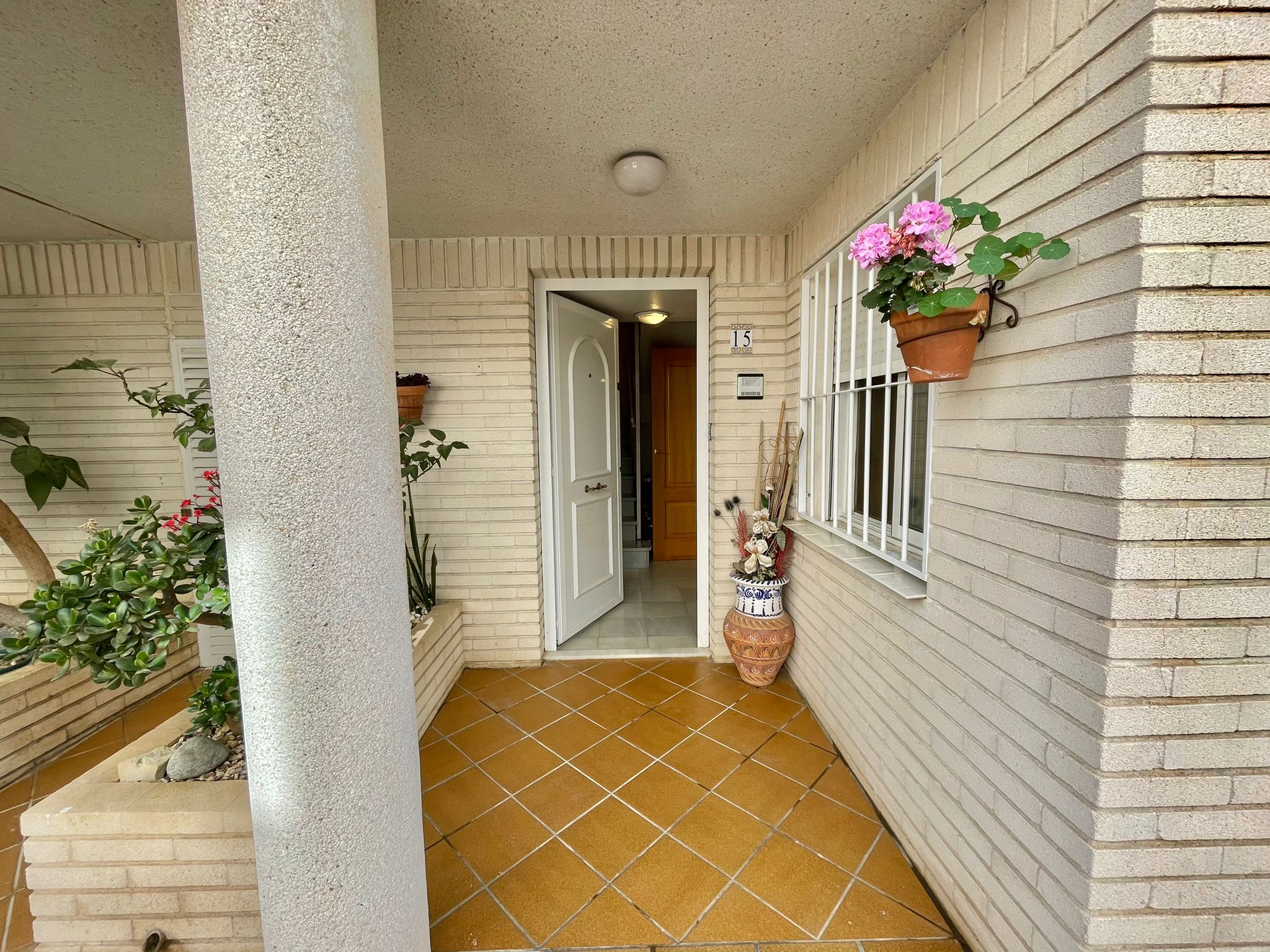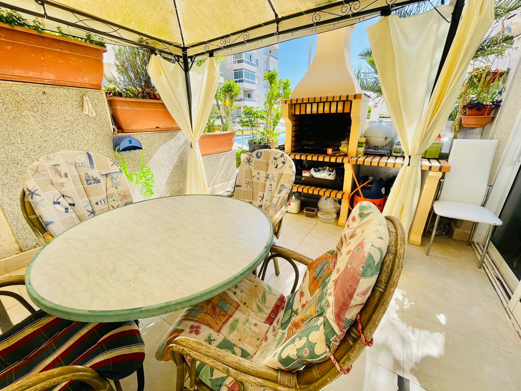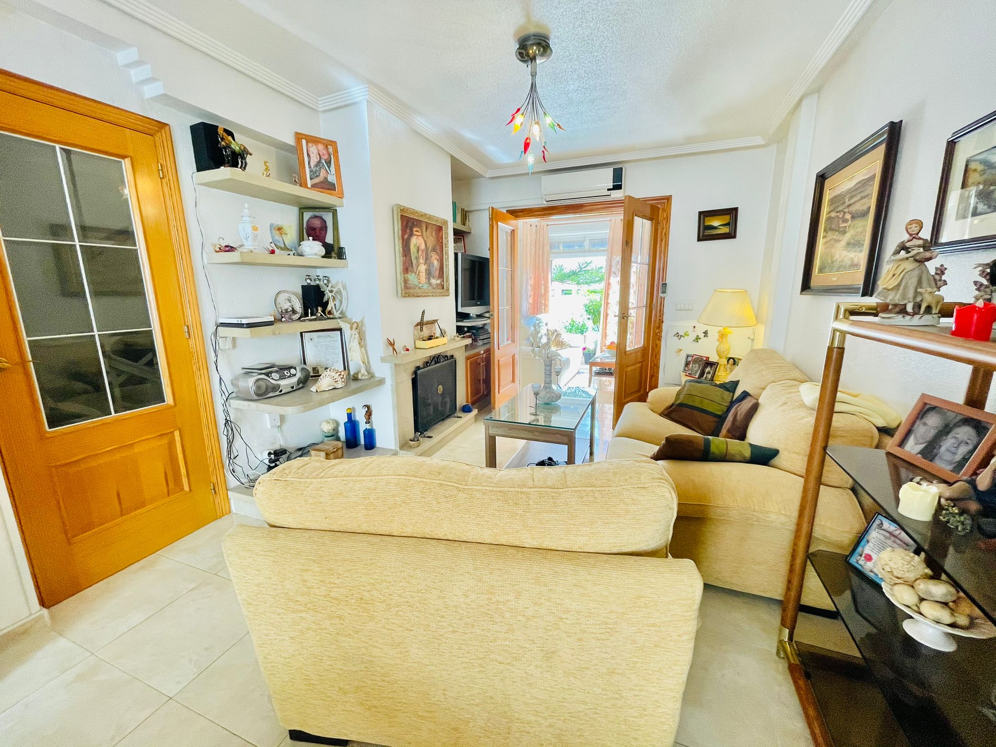 I første etasje har den en stue-spisestue med peis og aircondition, separat kjøkken, toalett og en innglasset veranda, den har også en flislagt uteplass på 30 m² med grill og tilgang til det felles bassengområdet.