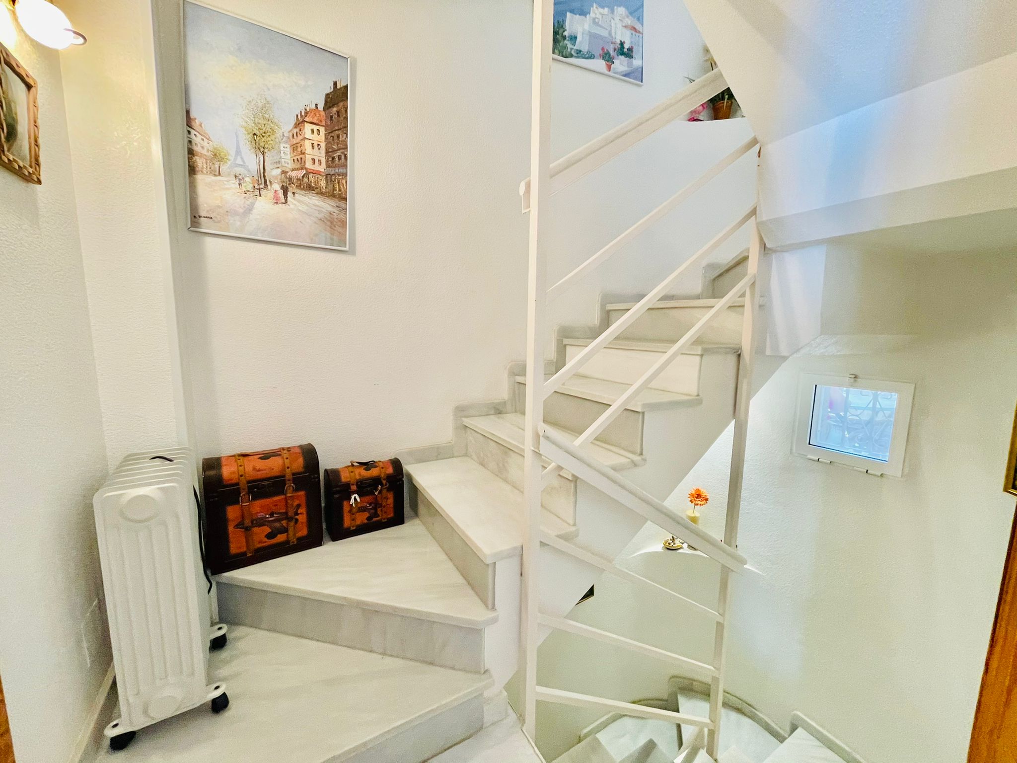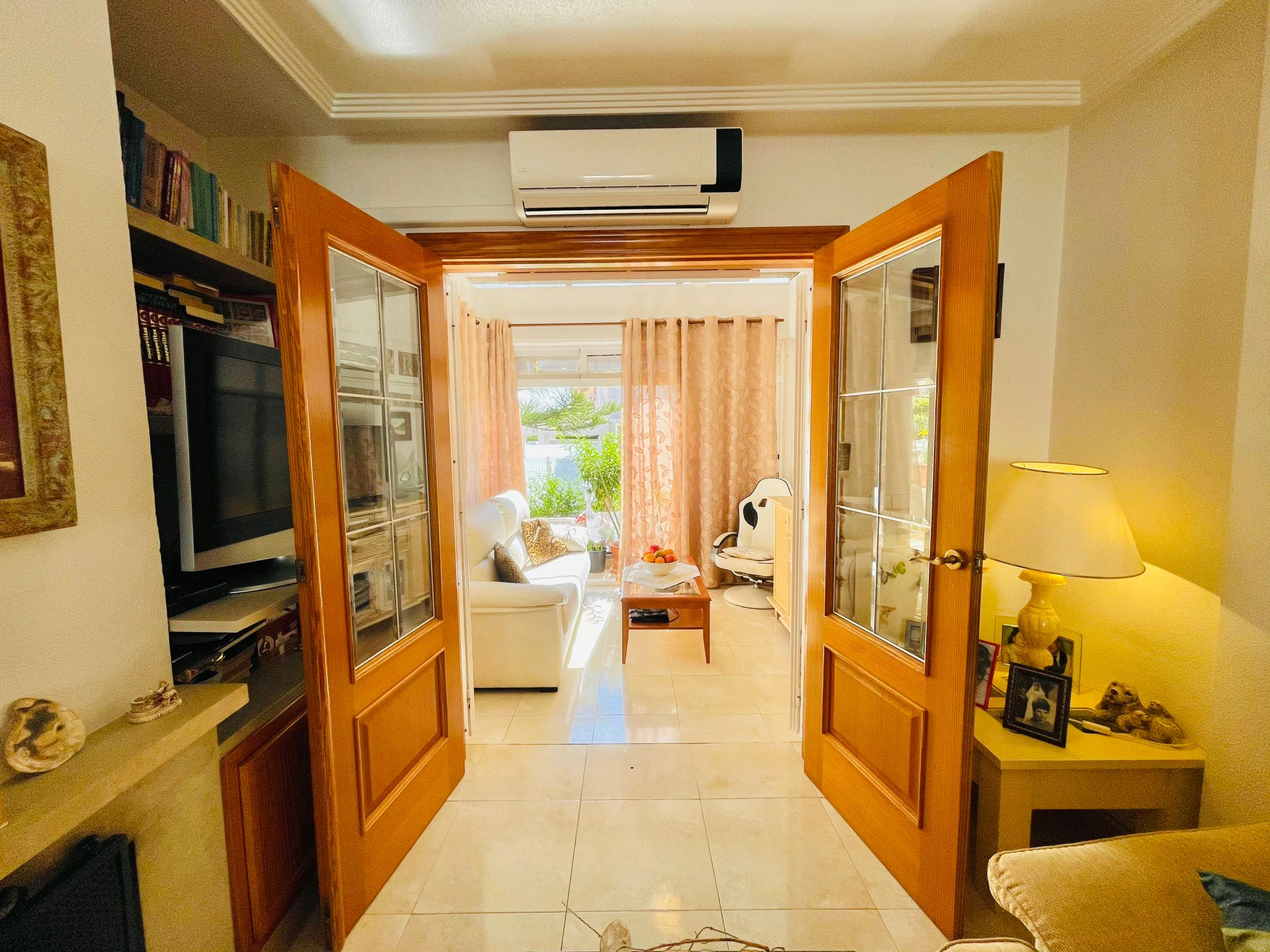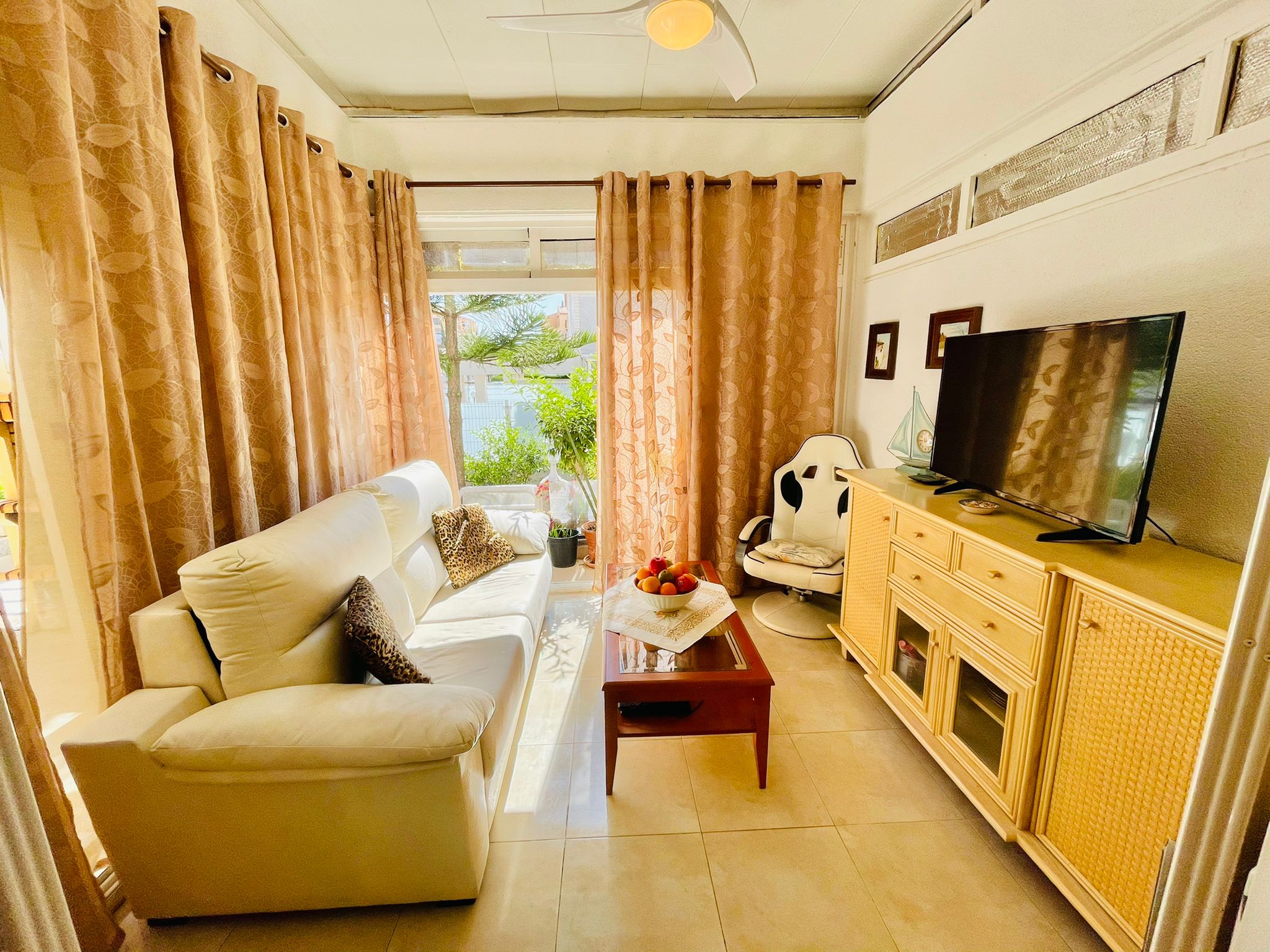 I første etasje har den en stue-spisestue med peis og aircondition, separat kjøkken, toalett og en innglasset veranda, den har også en flislagt uteplass på 30 m² med grill og tilgang til det felles bassengområdet.
