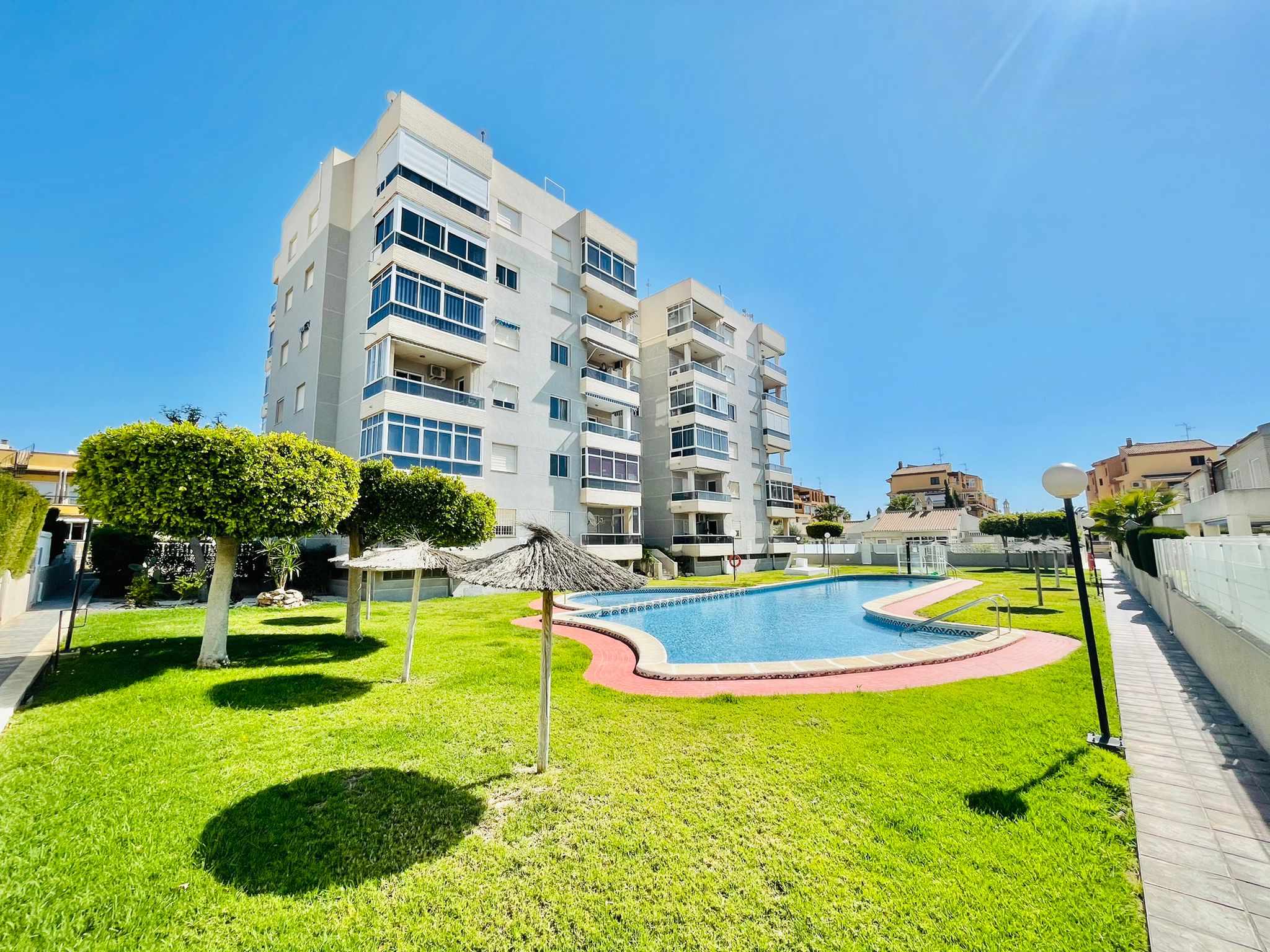 Det er god bussforbindelse til både sentrum av Torrevieja og til La Mata. Det er en hyggelig spasertur langes promenaden på omkring 45 minutter til Torrevieja sentrum. Dette er et flott område både for ferieturister og fastboende